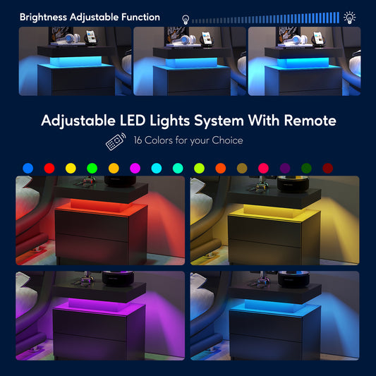 Nightstand LED Bedside Table Cabinet Lights Modern End Side with 2 Drawers for Bedroom (Black)