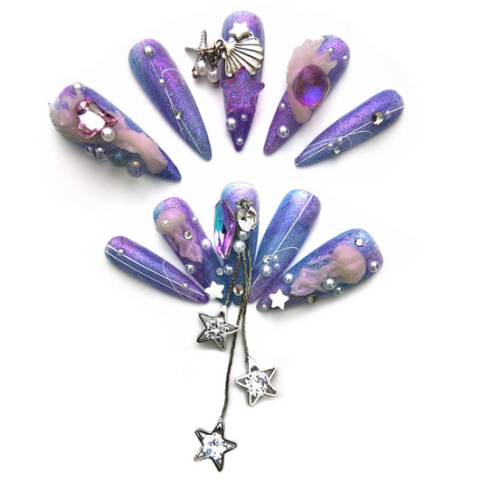 Luxury Handmade Press On Nail Baroque Style Long Pointed Nails with Diamonds, Acrylic, Faux Nail Set for Women(Mermaid's Dream, Large)