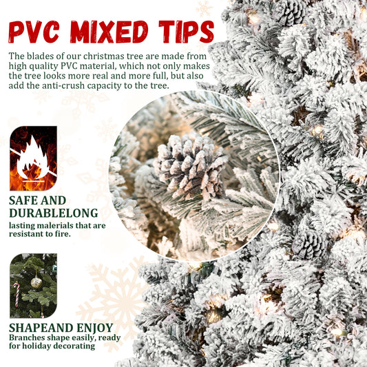 7FT Pre-lit Flocked Christmas Tree with 1,064 Memory Wire Tips – Effortlessly Fluffed, Perfectly Shaped, and Lit with 400 Warm Incandescent Lights Bringing Lasting Elegance and Wase to Your Holiday