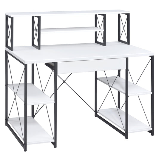 White and Black Office Desk with Open Shelves and Hutch