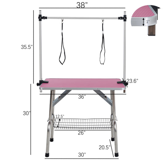 36" Folding Dog Pet Grooming Table Stainless Steel Frame Rubber Mat on Board with Adjustable Arm and Clamps pet dog Cat Grooming Table (PINK COLOR)