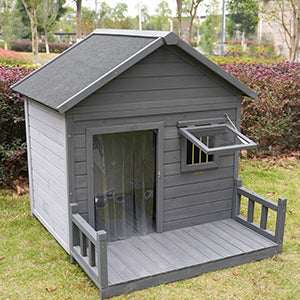 Large dog house, 44.2" long x 44.6" wide x 44.6" high solid wood asphalt roof dog house for large dogs with large terrace, weatherproof large dog house