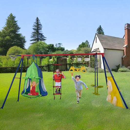 Outsunny Metal Swing Set with Glider, Two Swing Seats and Adjustable Height, Outdoor Heavy Duty A-Frame Suitable for Playground, Backyard, Multi-color