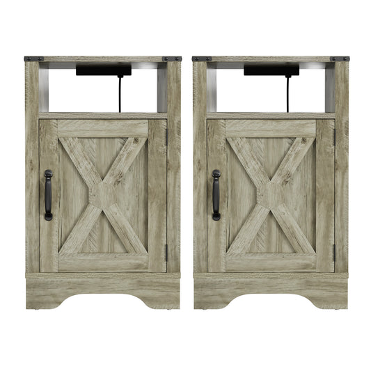 Farmhouse Nightstand Side Table, Wooden Rustic End Table, Tall Bedside Table with Electrical Outlets Charging Station (2 Sets) - Light Gray