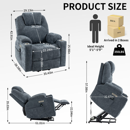 Up to 350 LBS Chenille Power Lift Recliner Chair, Heavy Duty Motion Mechanism with 8-Point Vibration Massage and Lumbar Heating, USB and Type-C Ports, Stainless Steel Cup Holders, Blue