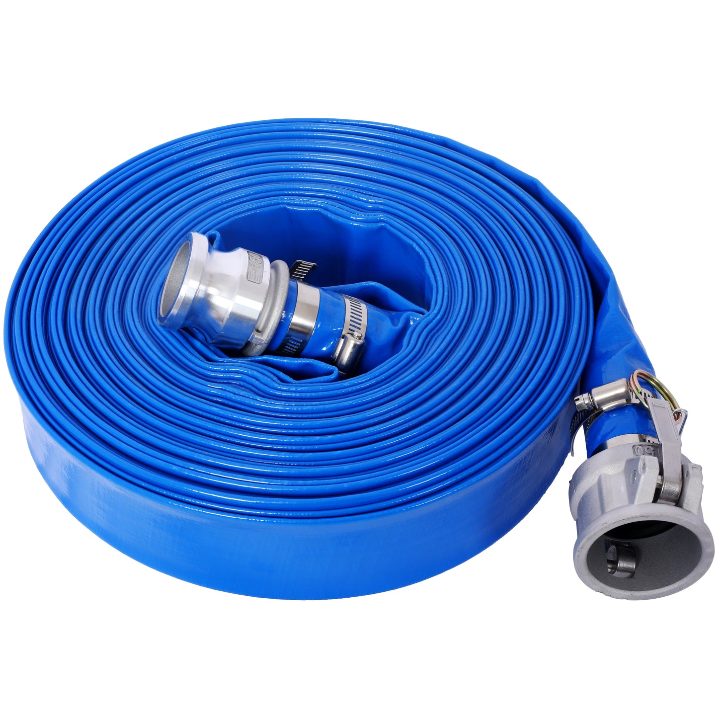 - The hose is 2 inches in diameter and 50 feet long, with a flat width of 3.4 inches. It features aluminum 2-inch male camlock coupling Type ‘E” and female camlock coupling Type ‘C” for secure and easy connections.