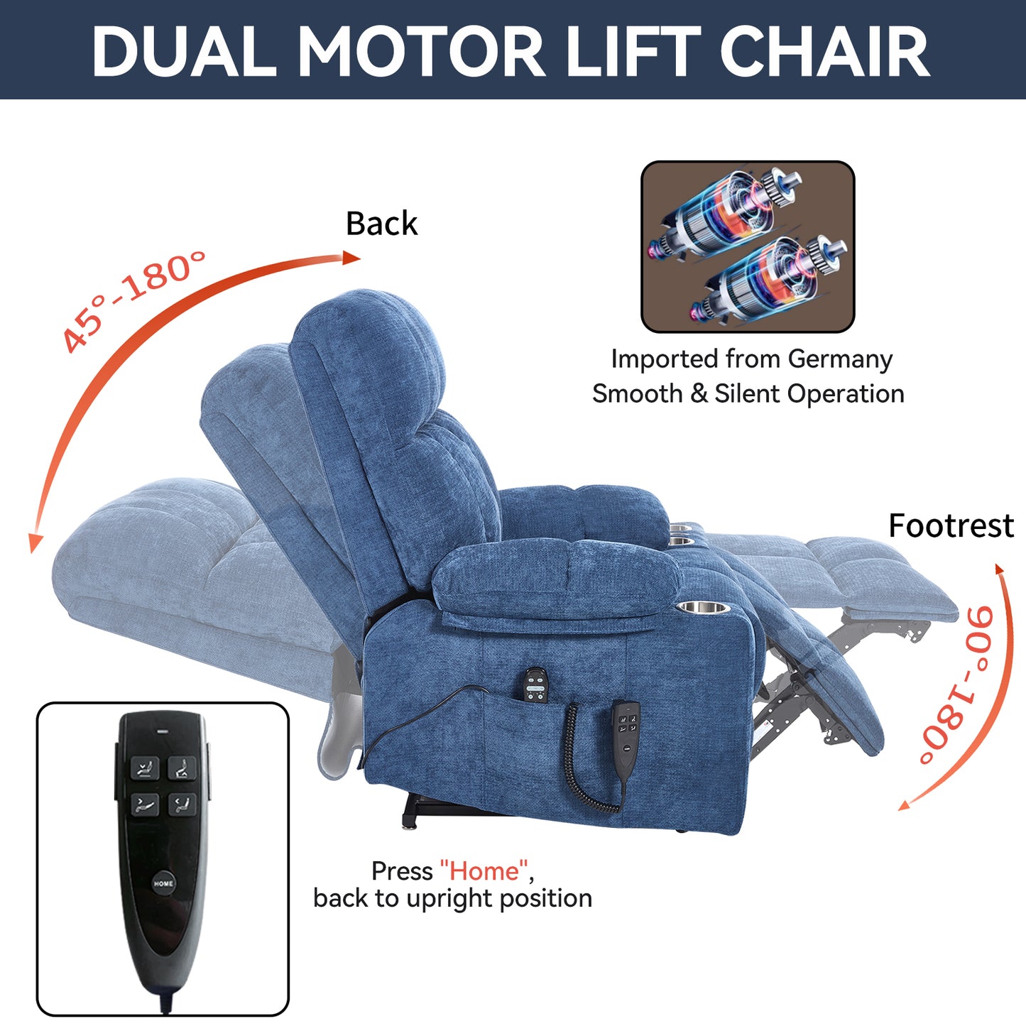 - POWER LIFT RECLINER CHAIR WITH DUAL MOTOR: You can press the power remote to control the lift or recline of the recliner chair, which means you can get any position you want, it's reclining close to 180 degrees or lifting. The lift chair is powered by electric motor mechanism to push the entire chair up, working smoothly and silently to help the elderly stand up easily. It's also ideal for people who have balance problems with legs or back, or who after surgery.