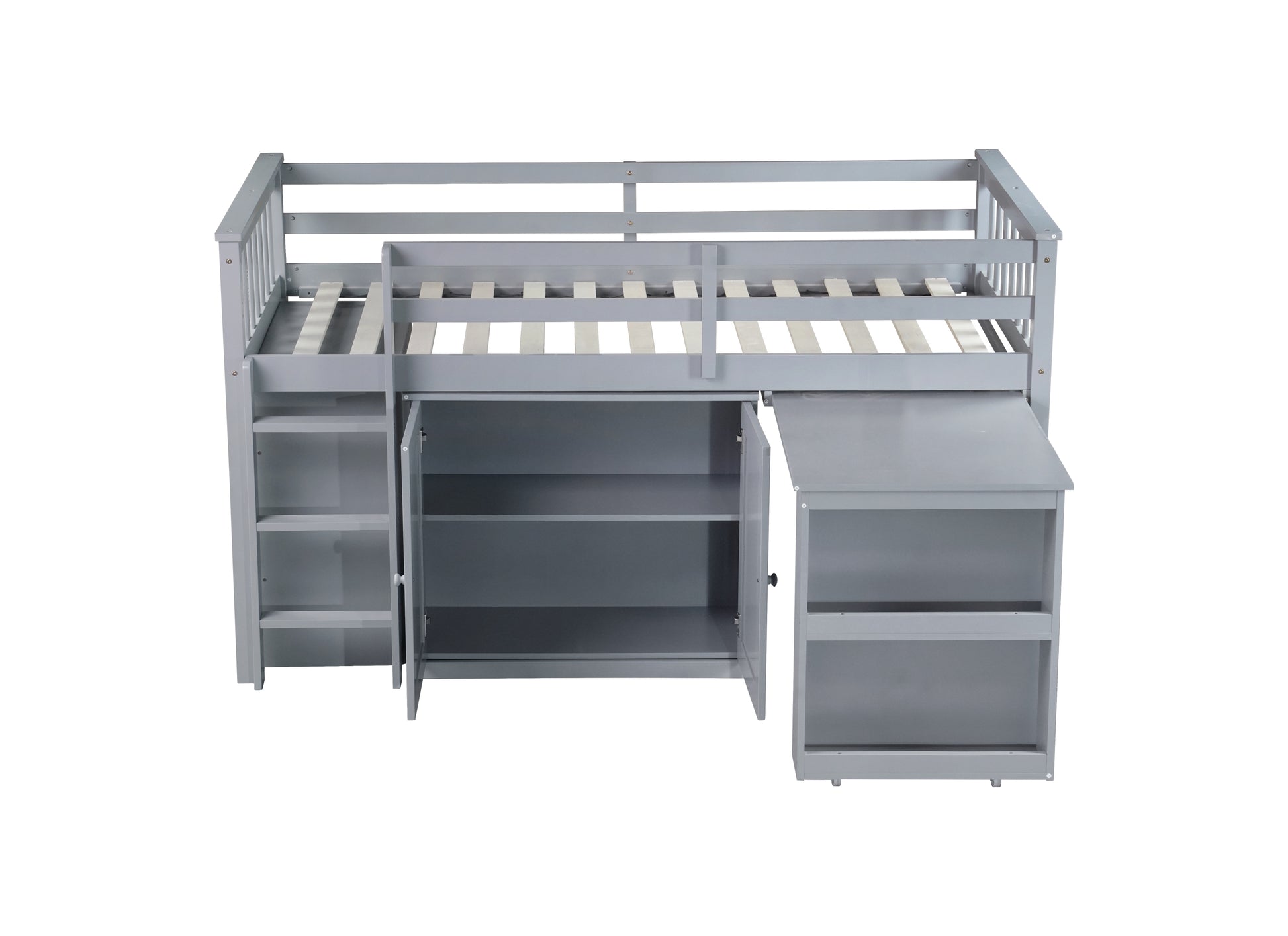 Twin Loft Bed with Storage Cabinet, Drawer and Shelf Cabinet and Pulling-Out Desk, Rubber Wood Loft Bed with Safety Guardrail, Ladder,Grey