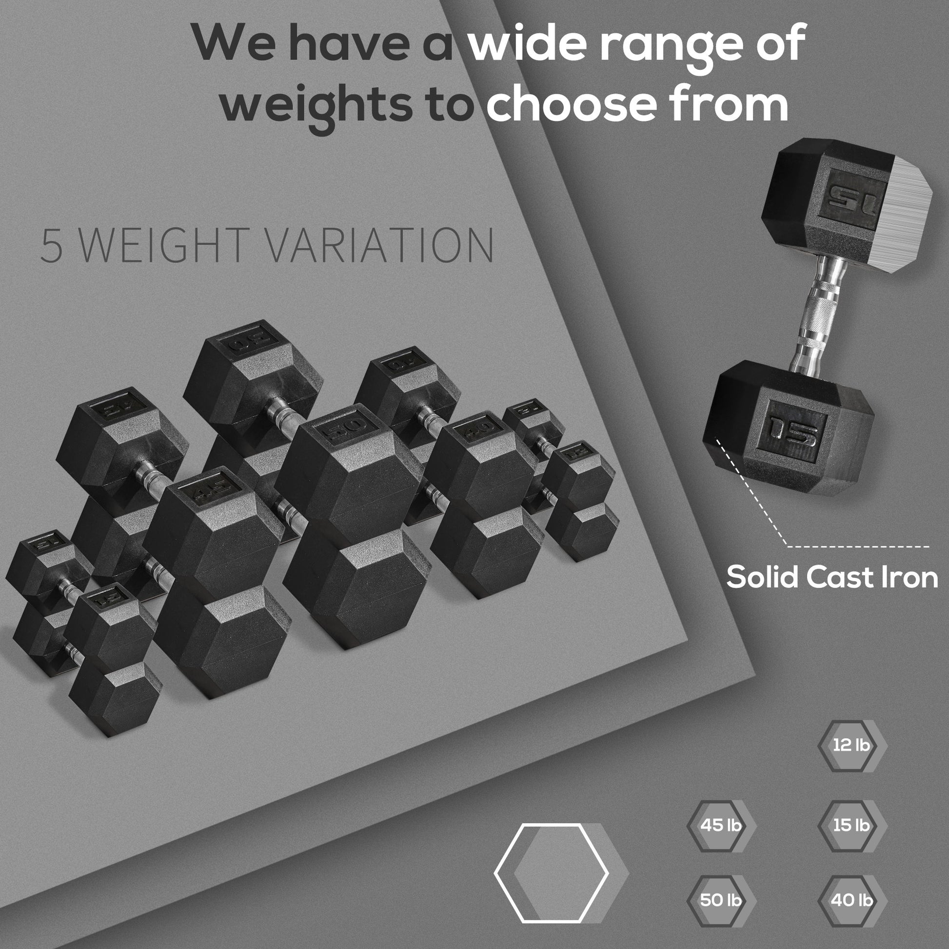 - Hexagonal Shape: The hexagonal shape prevents the dumb bells from rolling, keeping them right where you put them, even when rummaging in storage.