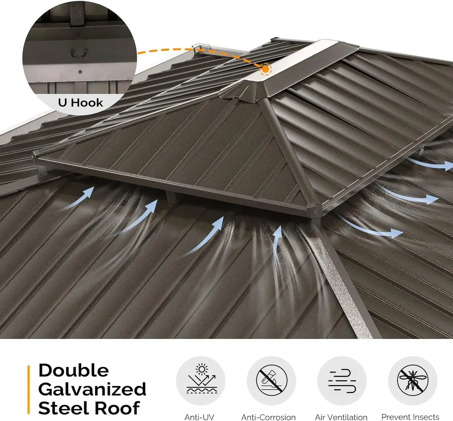- Double Roof Design: 10'x12' gazebo with a ventilated, double-layer galvanized steel roof helps prevent harmful UV rays, allows for air circulation, and can withstand wind. Enjoy the sun without getting sunburned under this pavilion
