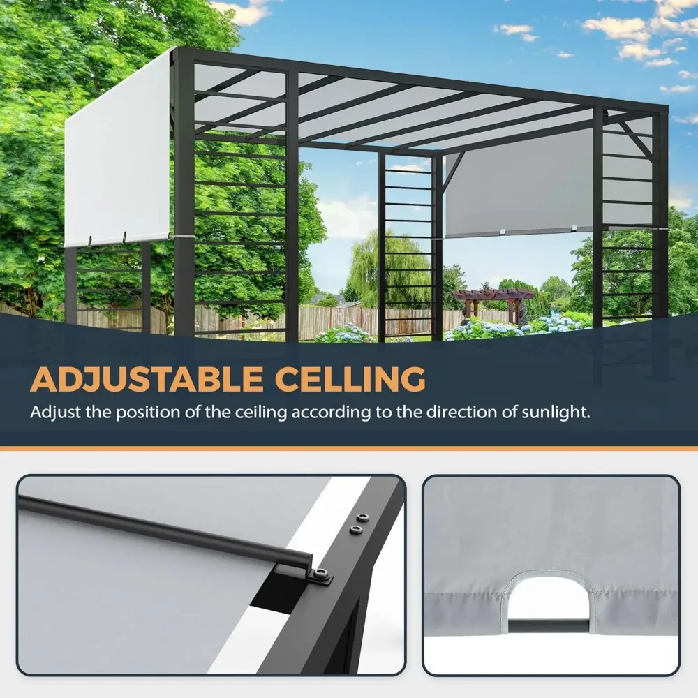 - Retractable Pergola Canopy: The adjustable canopy on this patio pergola allows you to create a comfortable outdoor environment, and the canopy can be adjusted according to the direction of the sun. Once you choose the right angle, you can use the straps to secure the canopy from the wind. If there is heavy rain or wind, please take down the tarp.