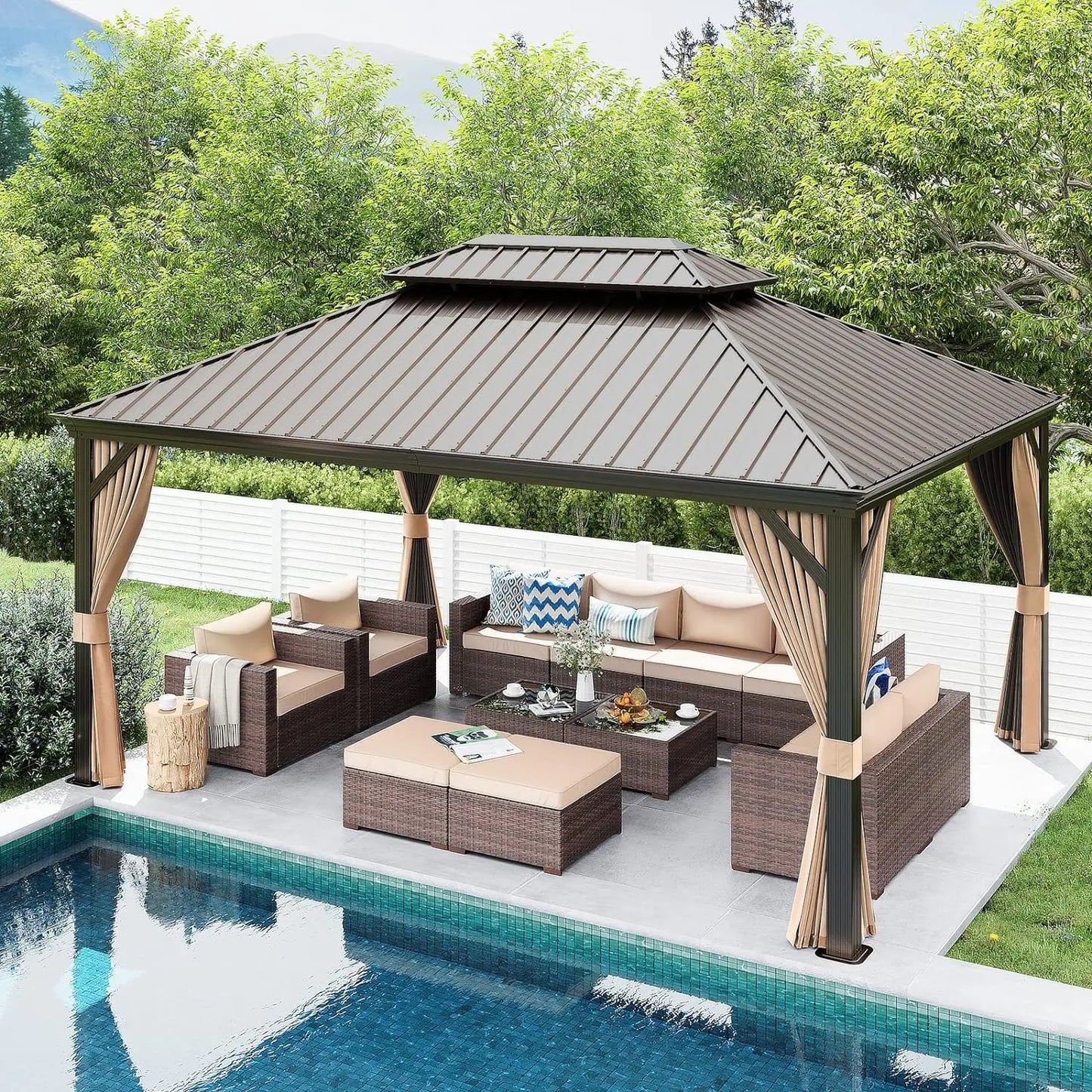 - 🎪 [Double Galvanized Steel Top]: Featuring a fade-resistant galvanized steel roof, instead of normal fabric material, this 10 ft. x 12 ft. Brown Hard Top Gazebo provides you with long-lasting durability and usage as you relax within your new outdoor oasis. The exquisite double-tier vented tops with unique metal mesh facilitate ventilation, cooling, and slowing down the wind speed.