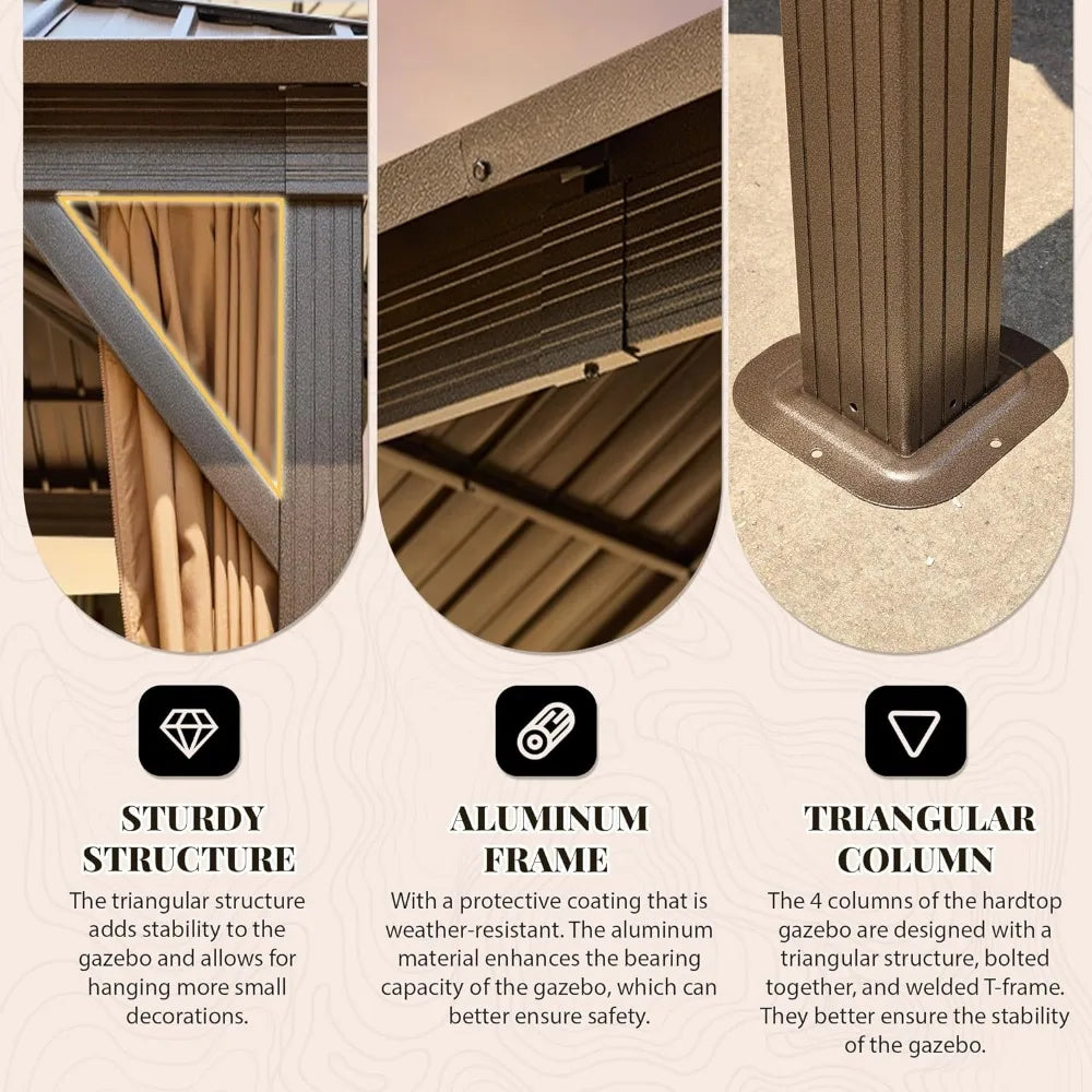 - 【RUSTPROOF ALUMINUM FRAME】- Sturdy powder-coated rust-resistant hardtop gazebo frame, very stable and sturdy, built with 4.7"x4.7" triangular aluminum stand pole, much bigger and stronger than standard models.All materials are built to last,never becoming rusty or deformed.
