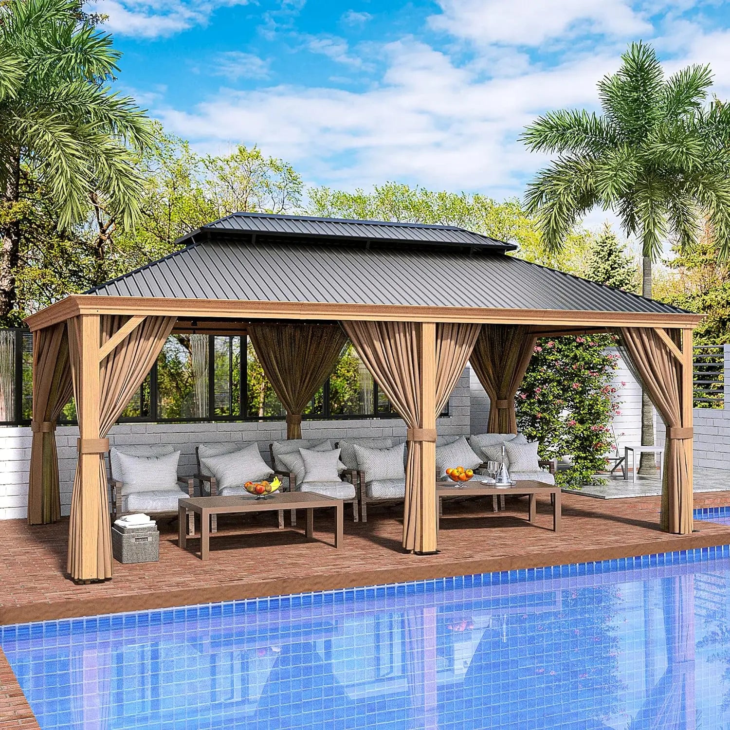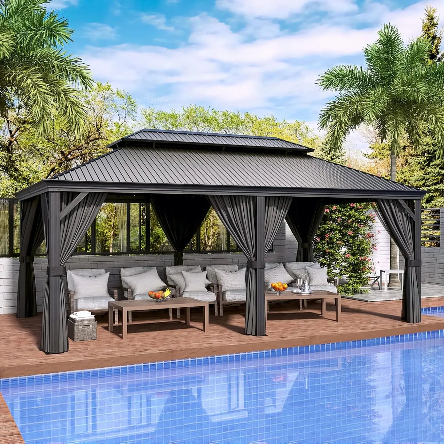 - Netting and Curtains: Our permanent hardtop gazebo sports a dual-slide design that features zippered, double-layered sidewalls. These sidewalls provide added protection, including sunlight, UV,rain,snow and Mosquito - and they enhance privacy too. Enjoy a safe, comfortable environment in your outdoor hardtop gazebo.