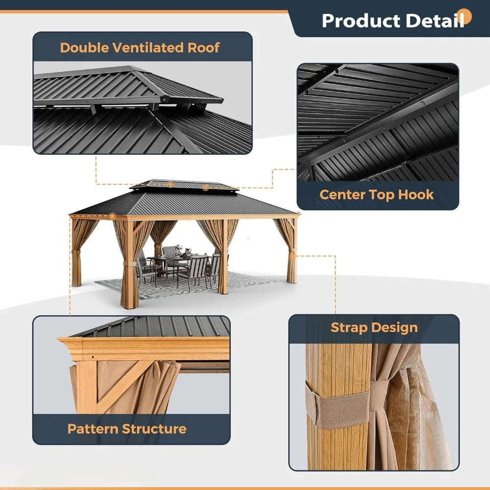 - Double Top and Hook Design: The double-roofed ventilated roof of the gazebo ensures air circulation while greatly improving stability in high wind conditions. The unique design can also give you a hint of cool summer. The hooks built into the center of the metal gazebo allow you to hang lights or other decorations for added comfort.