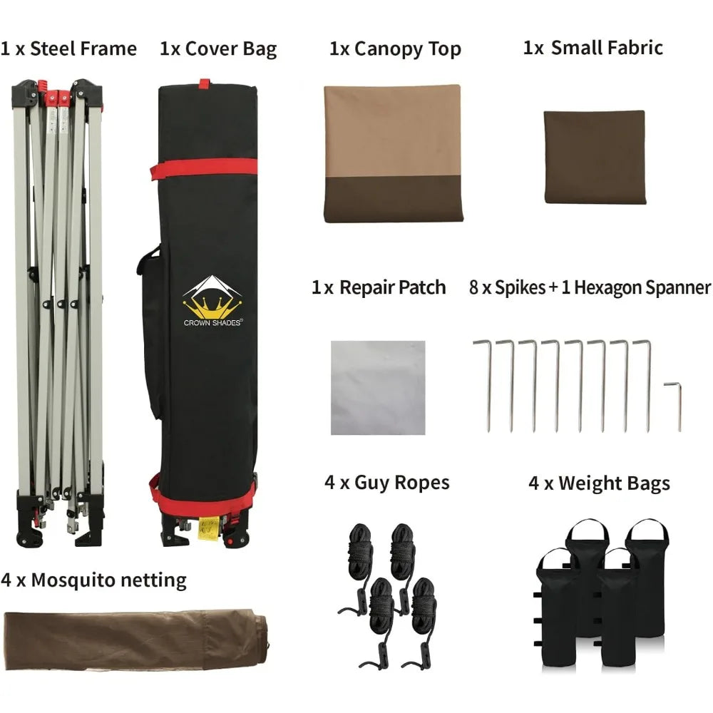 - [UPGRADE FABRIC]: Rugged 150D silver coated canopy fabric provides UPF 50+ UV protection. The CPAI-84 rated flame resistant fabric is water repellant and includes waterproof sealing tape to protect against water pooling in wet conditions.The removable netting-screen included to help keep pests away.
