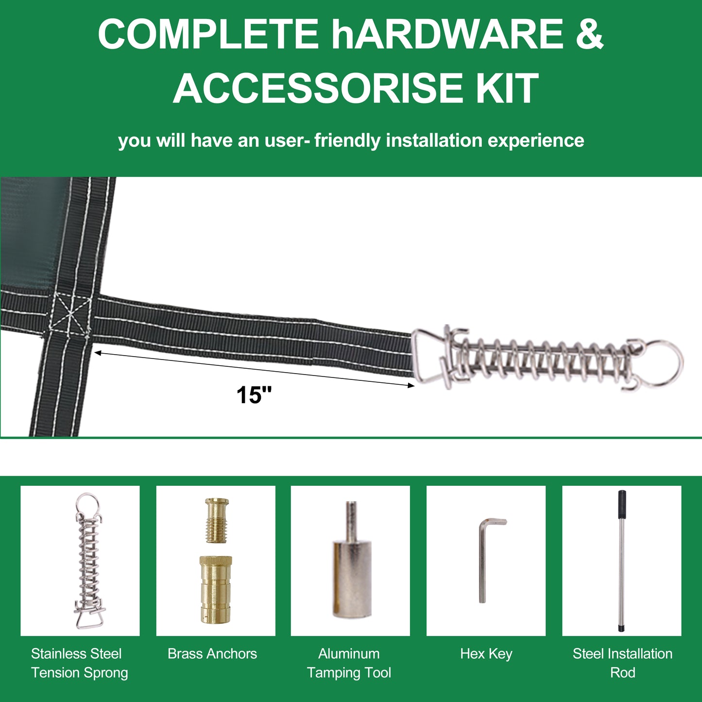 - Easy Installation with Complete Hardware Kit: The pool cover comes with a comprehensive installation kit, including brass anchors, stainless-steel springs, sleeves, and installation tools. The user-friendly setup, with an efficient drill and tamp anchoring system, ensures your pool cover is securely in place for reliable protection.