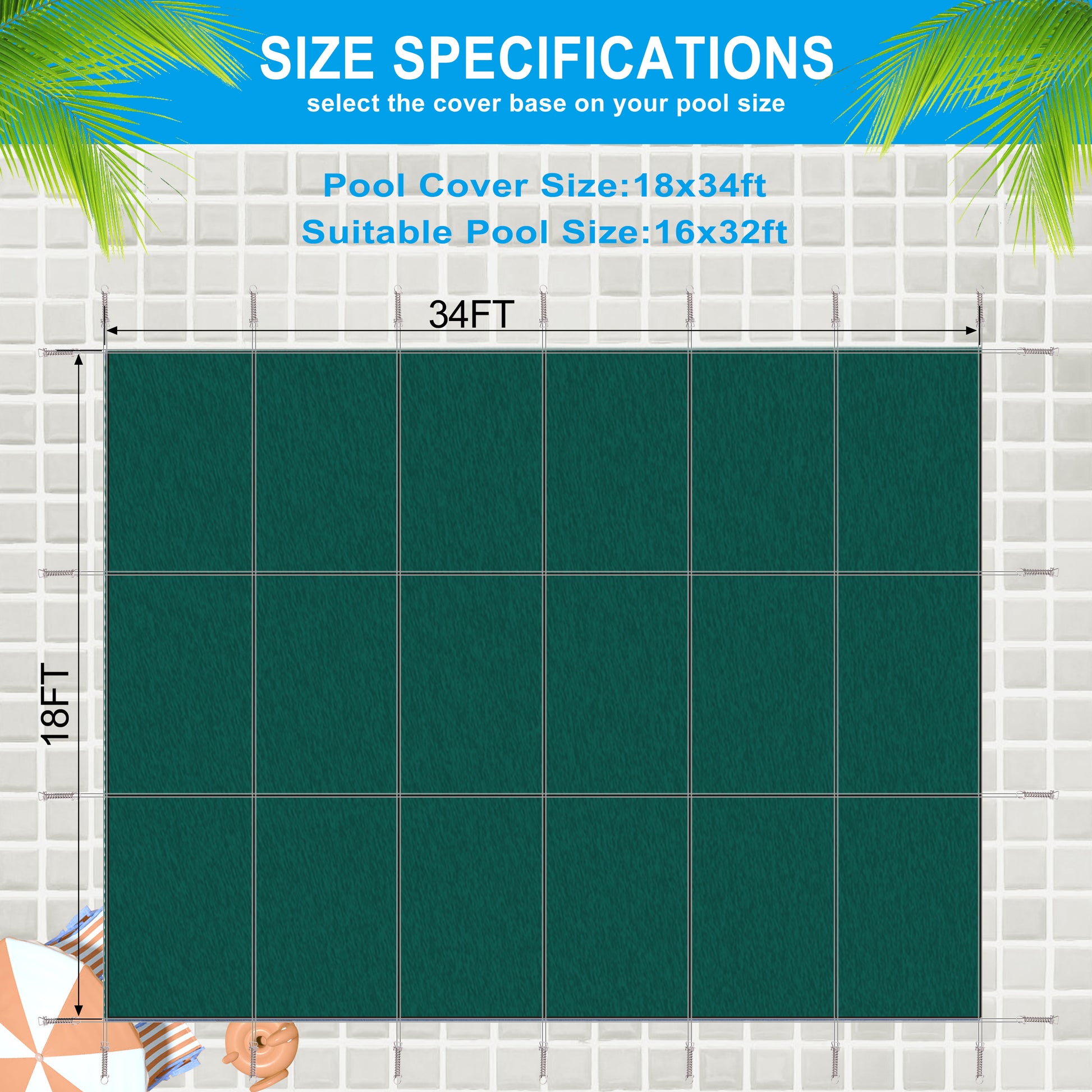 - Perfect Fit for Inground Pools: This inground pool safety cover measures 18 x 34 ft, ideal for pools with dimensions of 16x 32 ft. Designed to be slightly larger than your pool, it provides a secure fit without stretching. Ensure accurate pool measurements before purchase. Suitable for various pool types, it is perfect for residential, garden, and hotel pools alike.