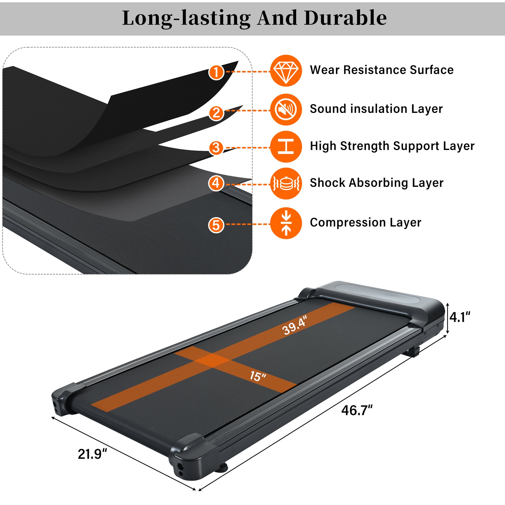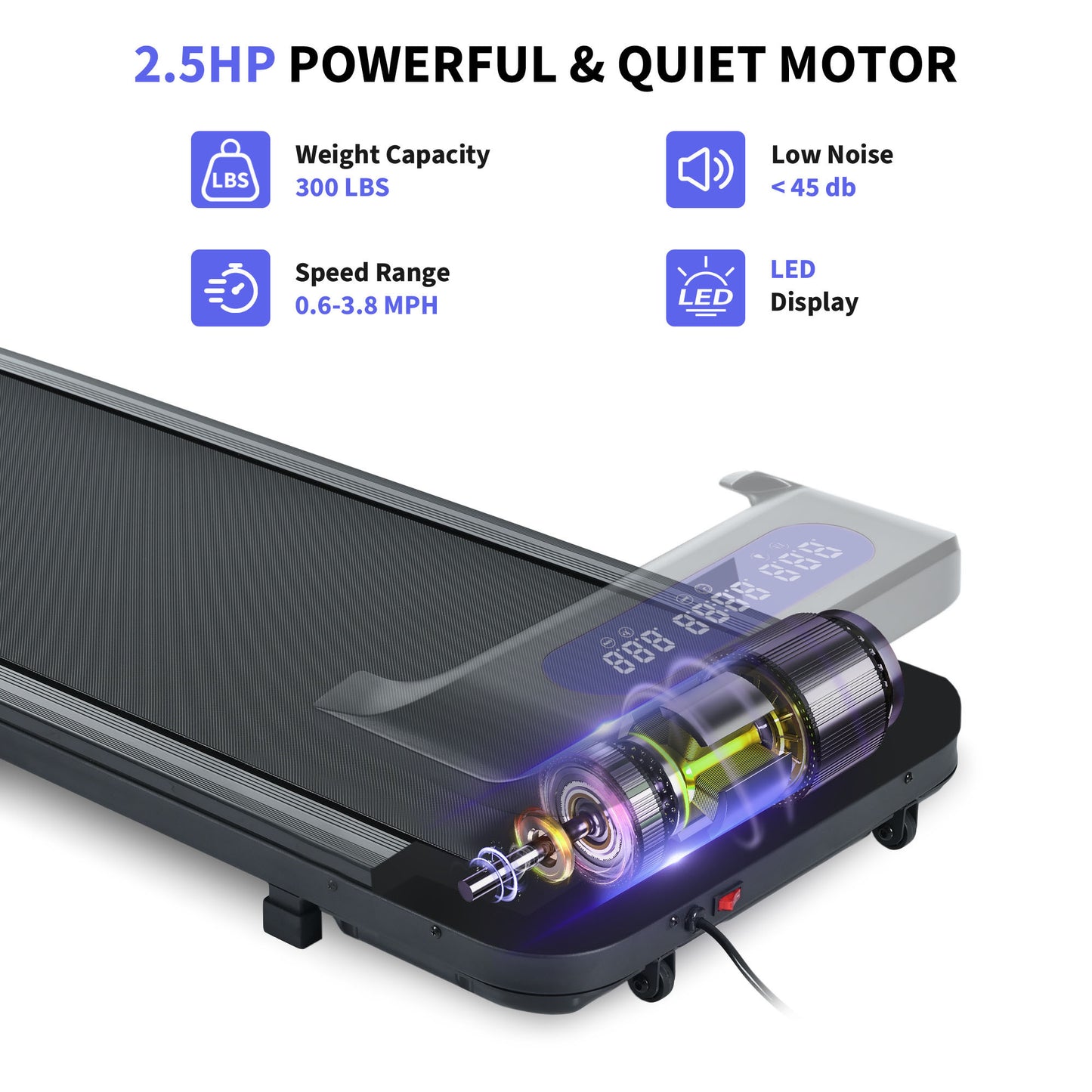 - Powerful 2.5HP Quiet Motor: Equipped with a 2.5 HP high-power silent motor, the walking pad is perfect for running, jogging, and walking in the comfort of your home. The durable steel frame and multi-layer shielding design, shock absorption, and noise reduction of the treadmill under the table make your running quieter, safer, and more comfortable.