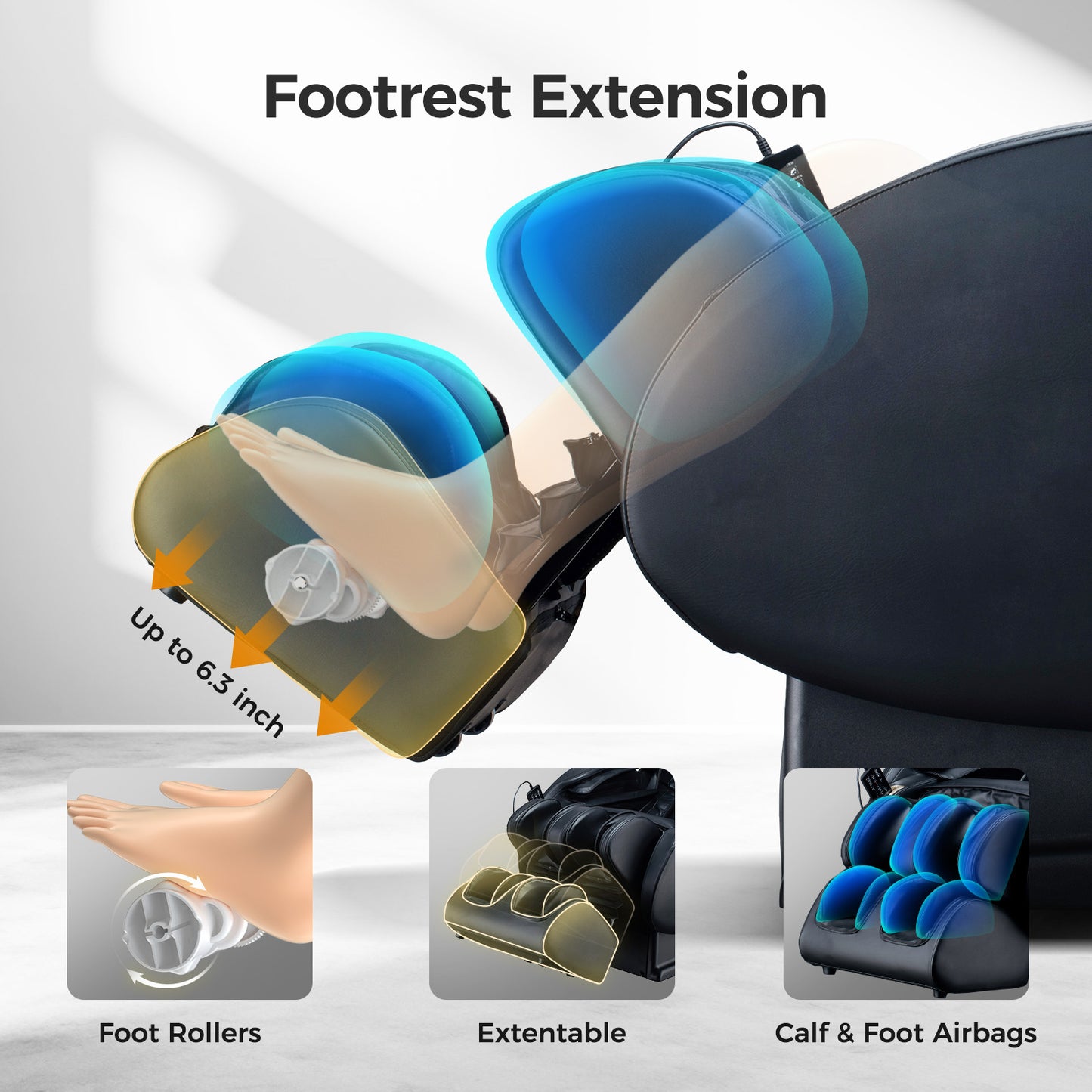 - Full body airbags-The massage chair features strategically placed airbags throughout the chair to provide a full body massage experience. The airbags gently inflate and deflate to mimic the sensation of a human touch, promoting circulation and reducing muscle soreness.