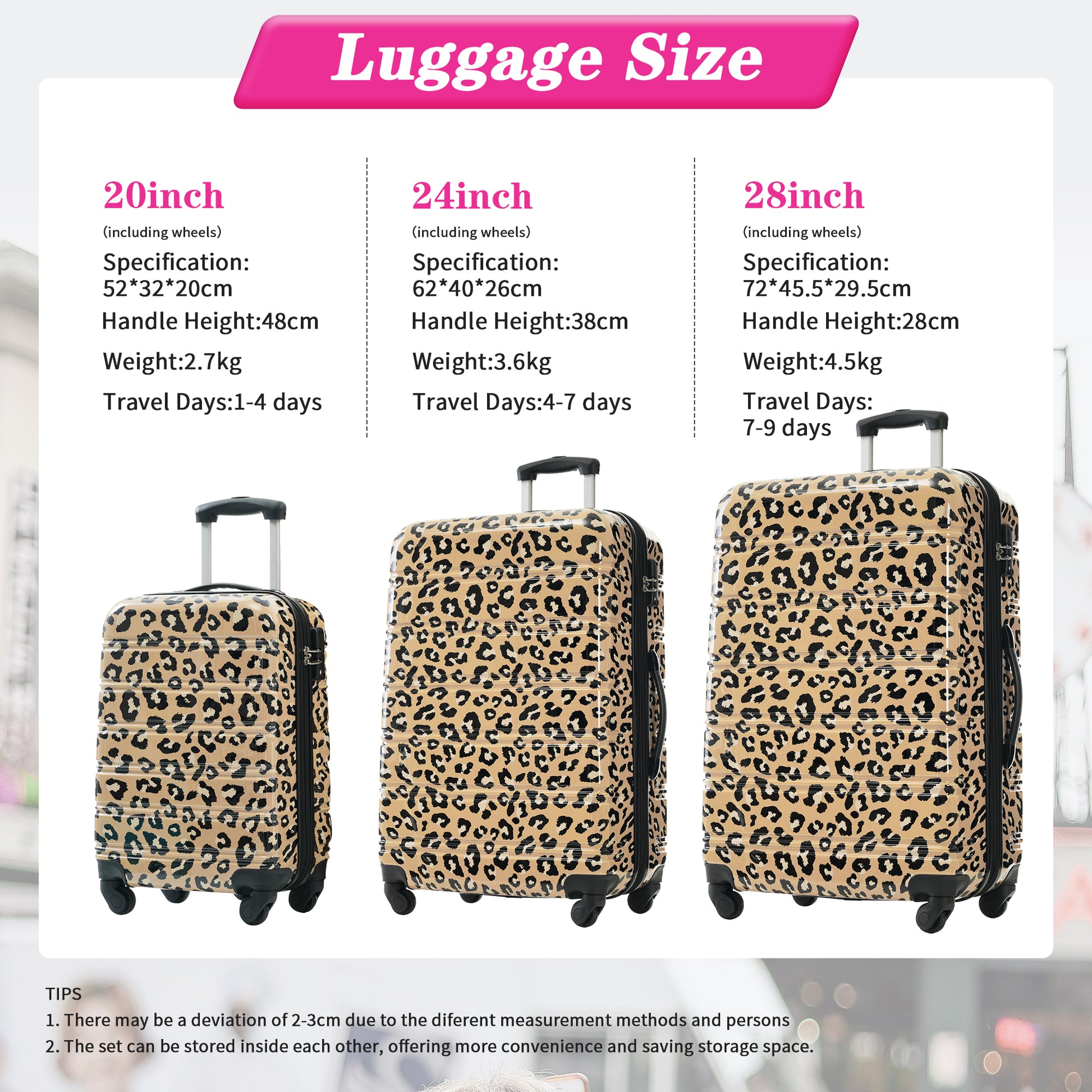 - Material: These luggage sets with wheels are made from high tenacity PC material, harder and more resistant to pressure, effectively reducing damage caused by collisions during travel.The surface of the suitcase is designed with leopard pattern, which is more fashionable.