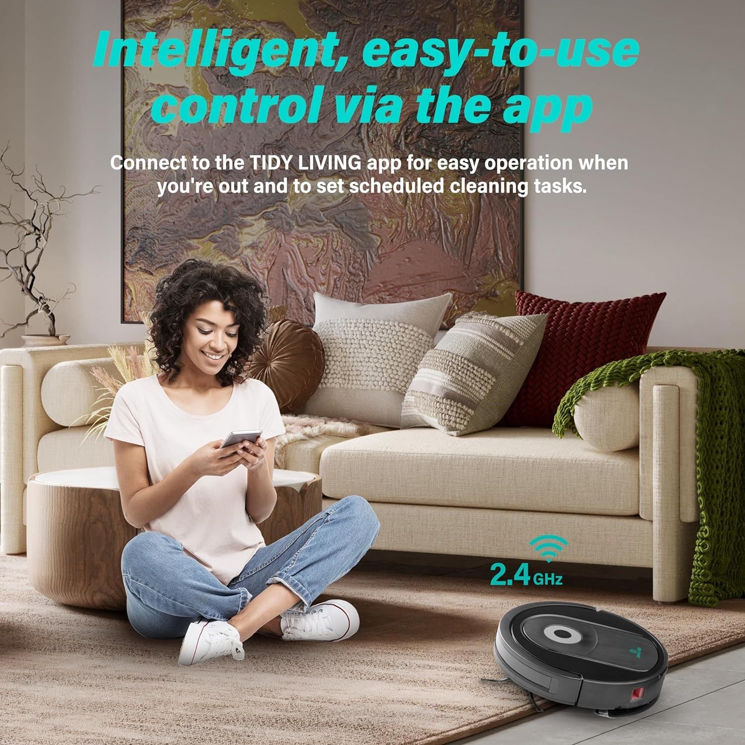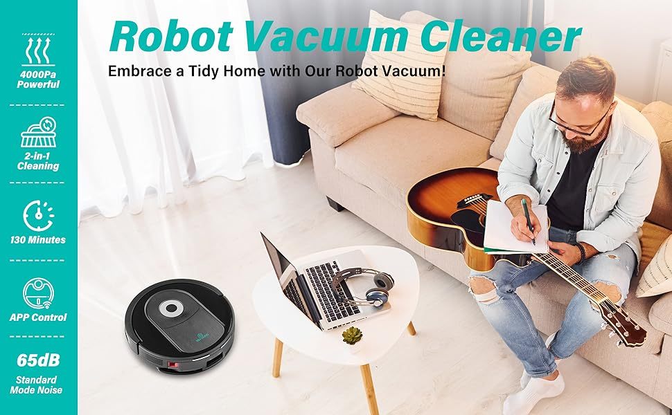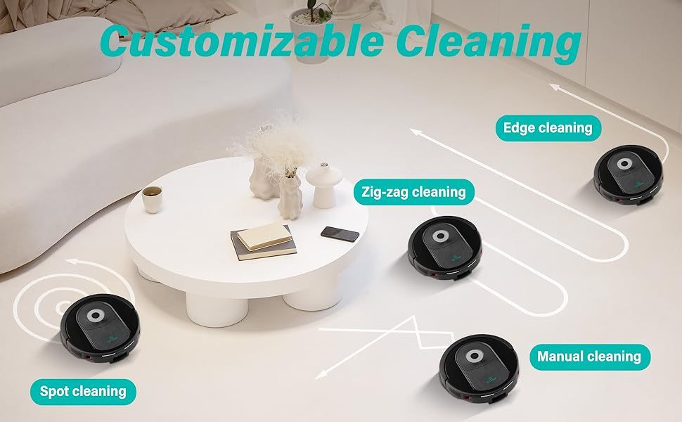 - [Multiple Cleaning Modes & Easy to Use] Robotic vacuum cleaner offers 4 clean modes including 1️⃣Spot cleaning 2️⃣Edge cleaning3️⃣Single room cleaning 4️⃣Manual cleaning. The 4000Pa maximum suction power enables robot vacuum to lift more debris, pet hair, and dust effortlessly from tile, hard floors & carpets, which makes cleaning efficient and thorough.