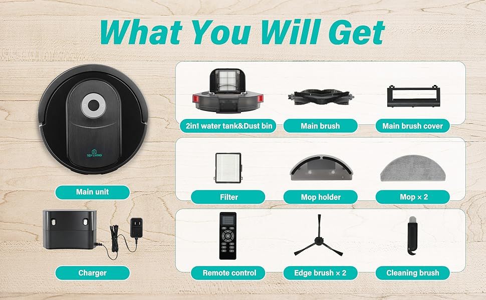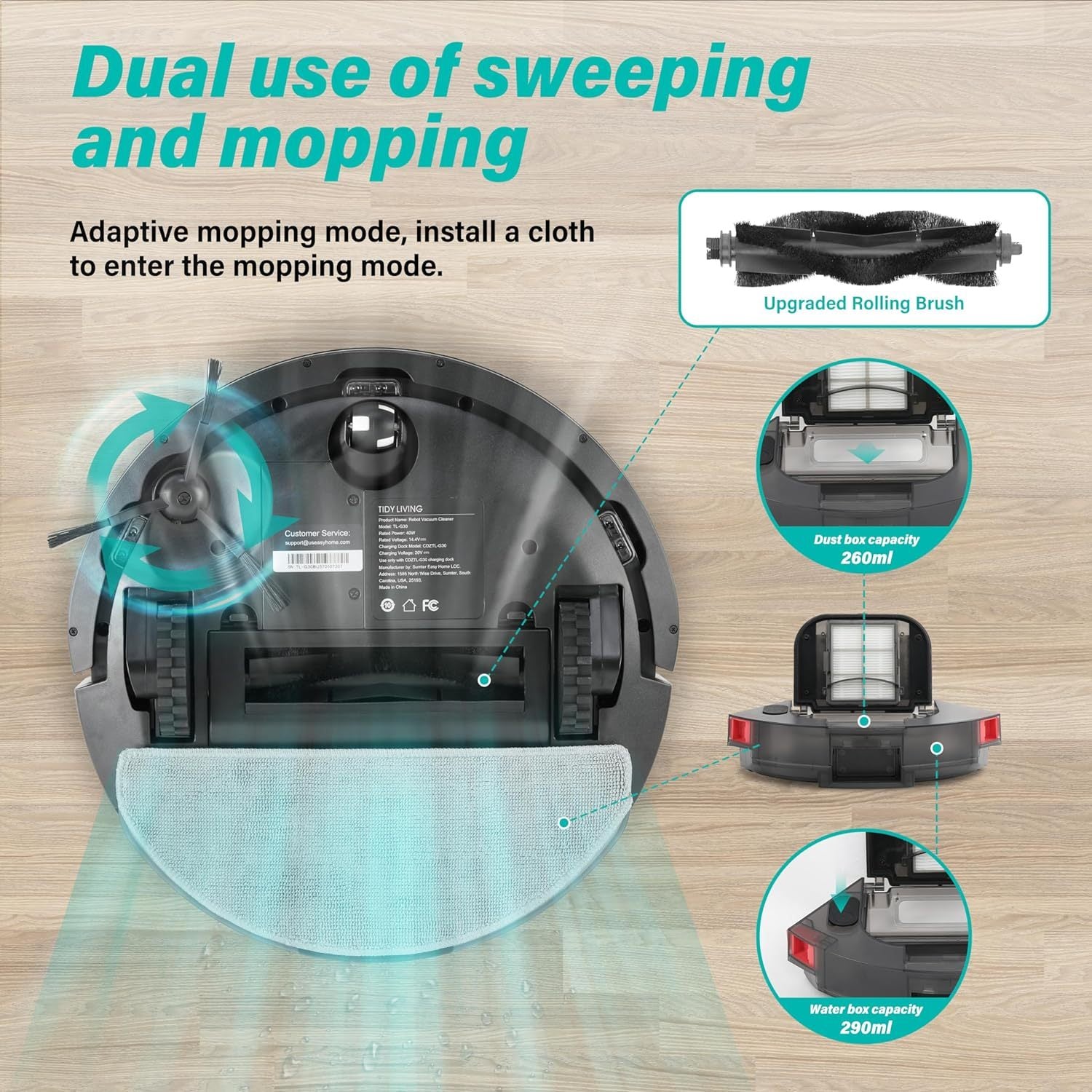 - [2-in-1 Robot Mop & Vacuum] Robot vacuum and mop combo combination, very suitable for cleaning pet hair, food debris and other garbage.Equipped with 260ml dust box and 290ml water tank as well as a roller brush. The 260ml dust box can hold more garbage, and the powerful suction motor with the roller brush can make vacuuming easier. Dry and wet two washes, meet different cleaning needs, and completely free your hands.
