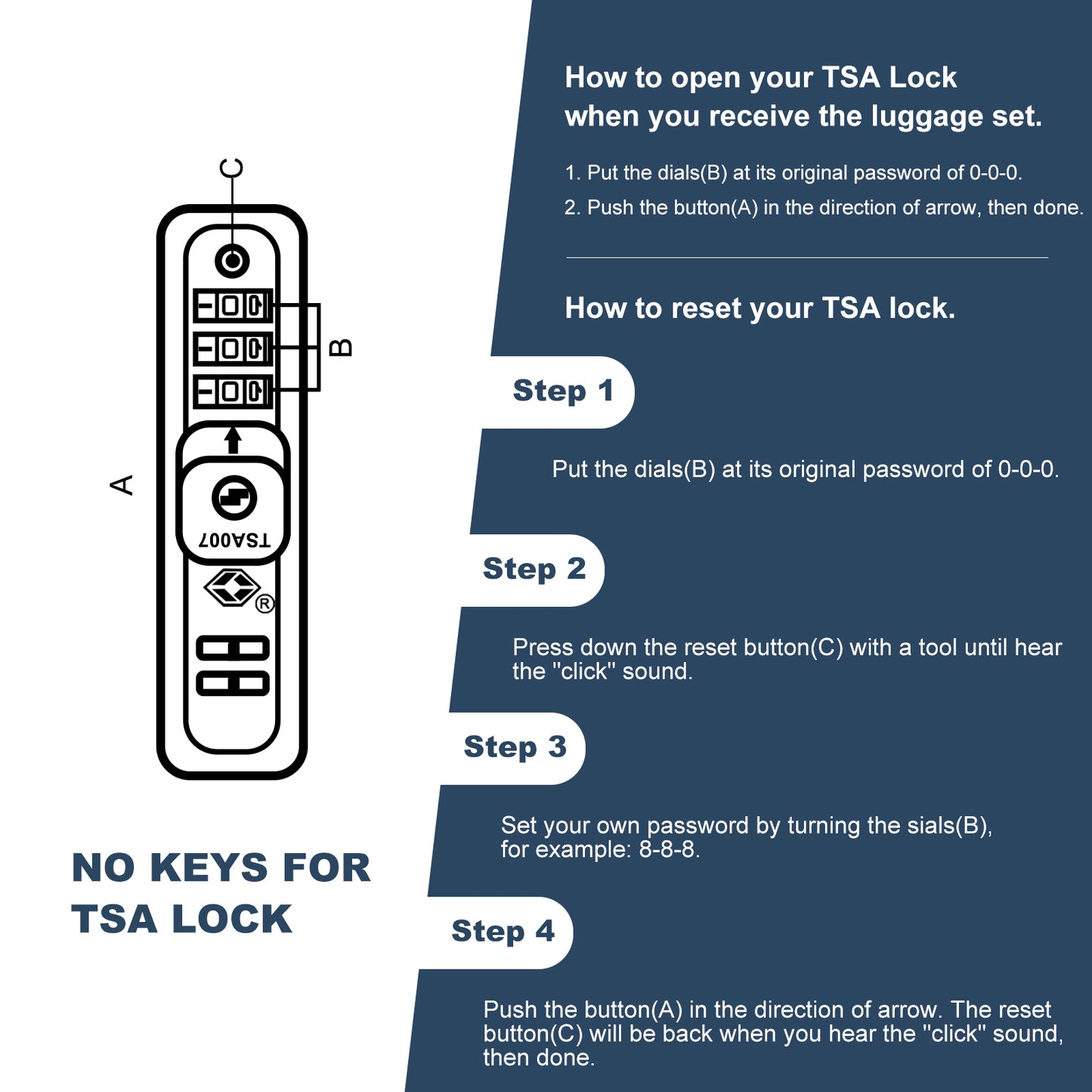 - TSA lock allows only customs agents to inspect your luggage without damaging the lock and protects your stuffs in luggage and privacy more better. Simply set the combination. No keys are required.