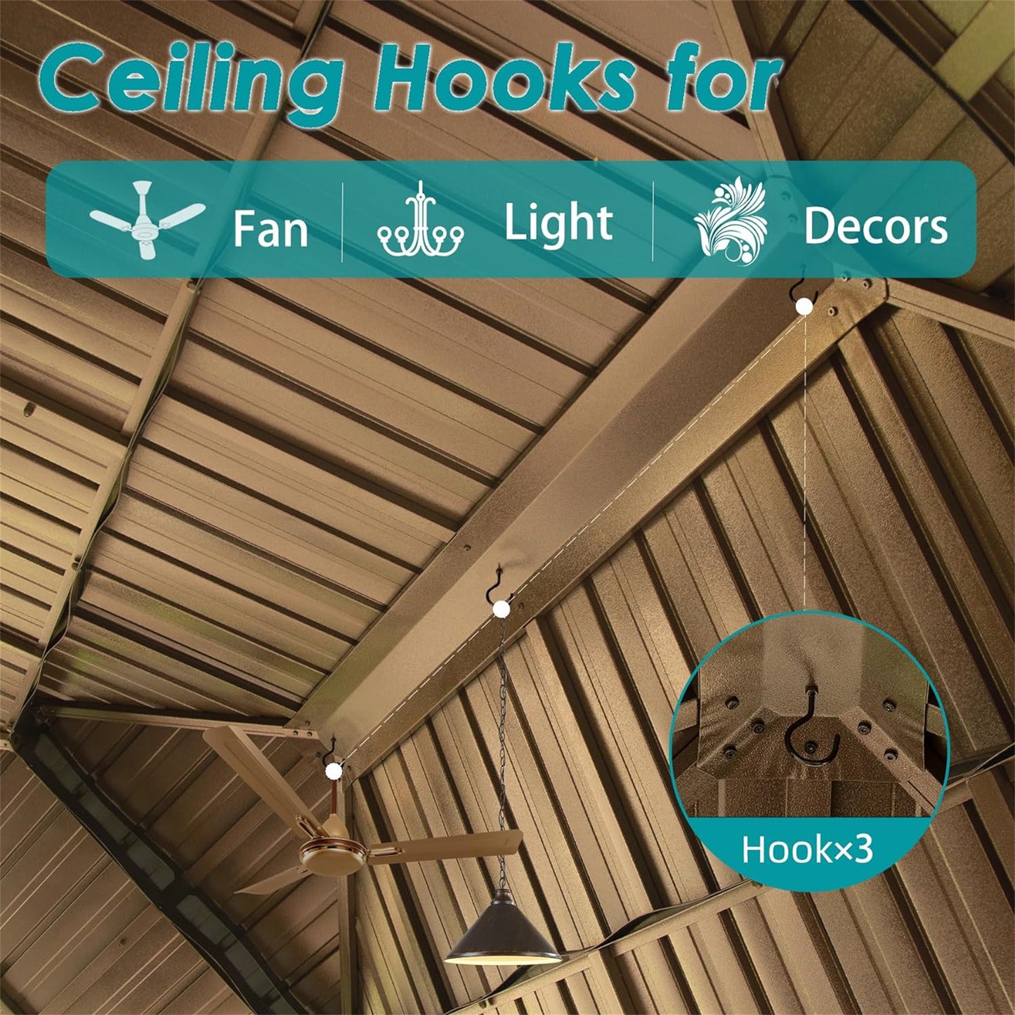 - Effortless Ambiance with Strong Hooks - Enhance your hardtop gazebo's versatility with 3 robust hooks! Each hook effortlessly holds up to 20 lbs, allowing you to hang lights, fans, or decorations effortlessly. Create your perfect outdoor atmosphere with ease.