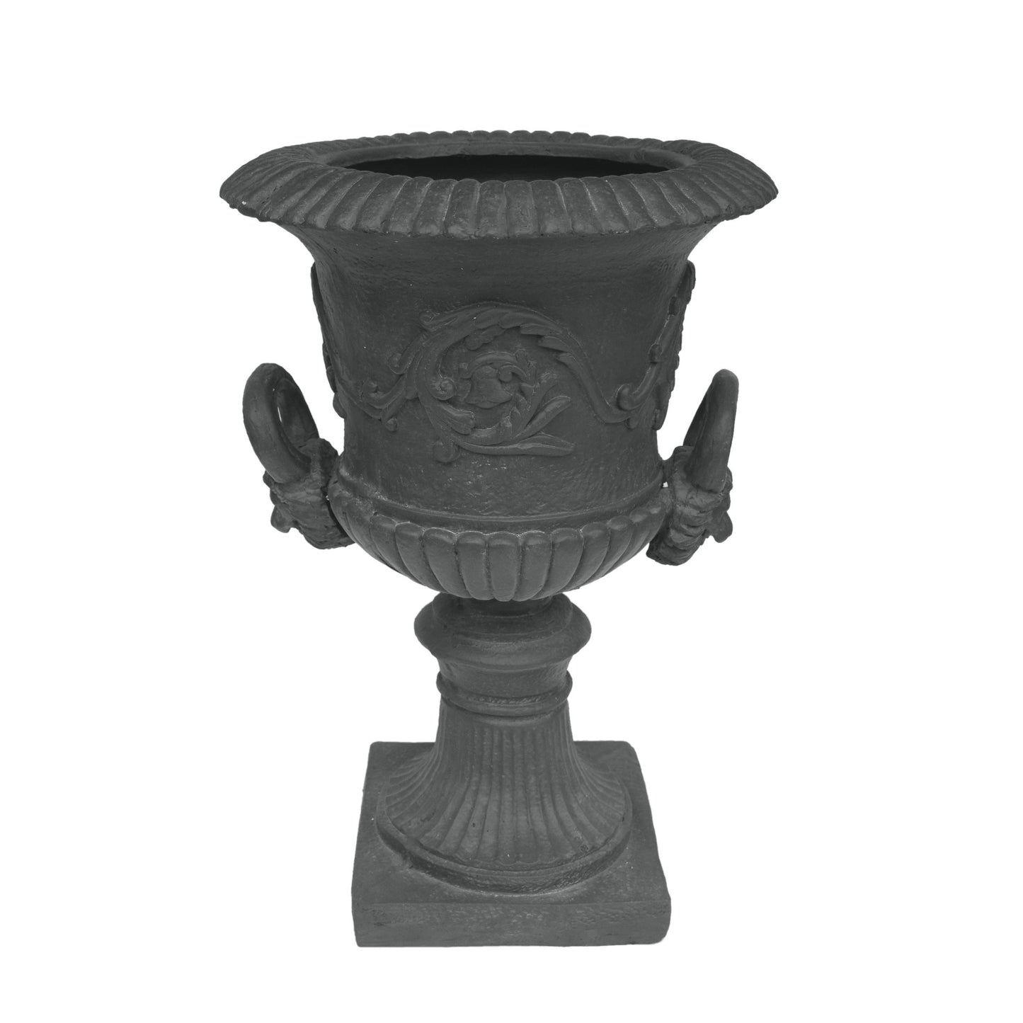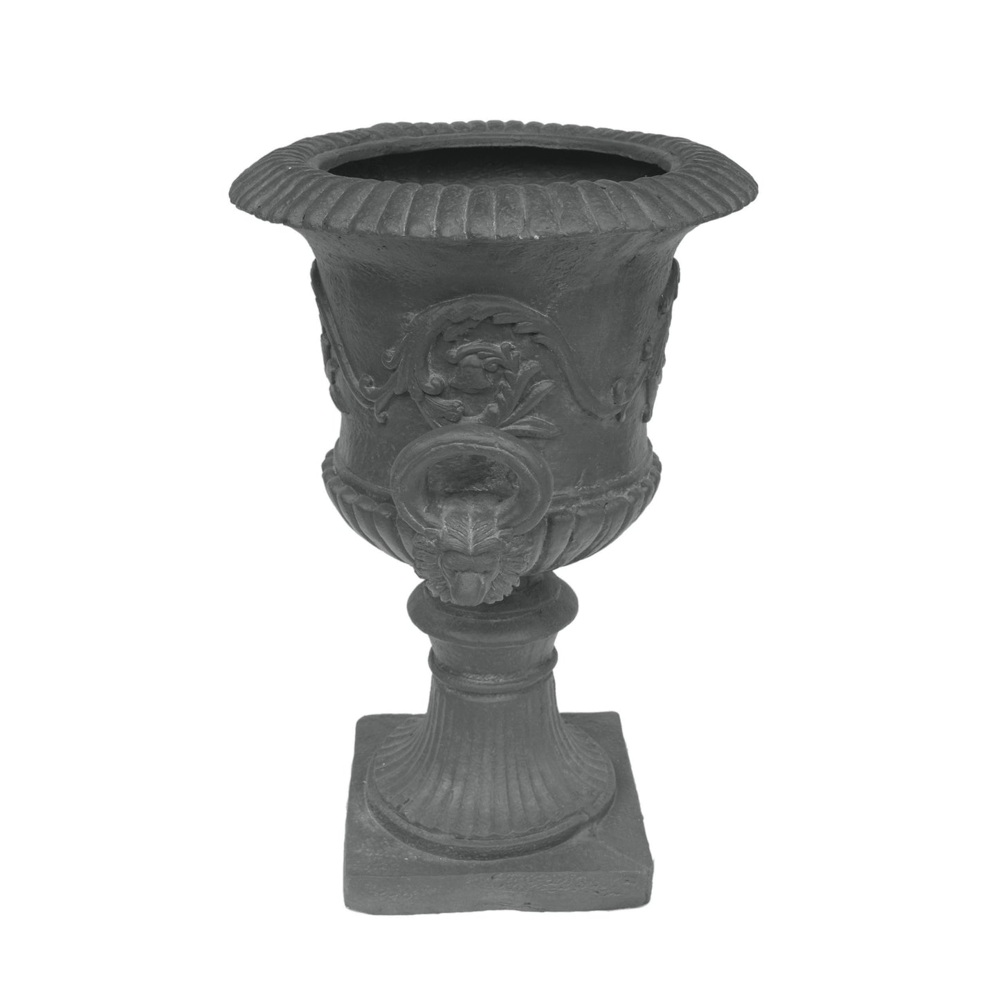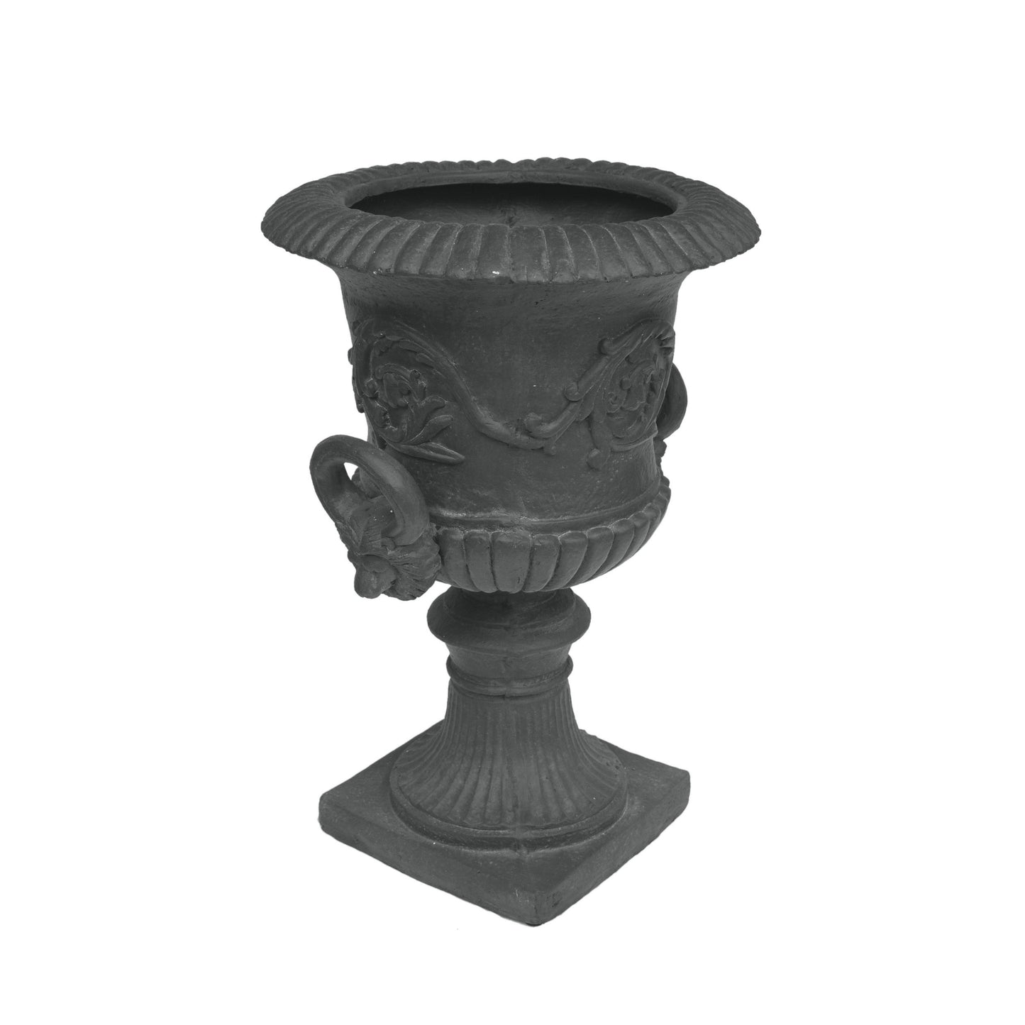 - This Concrete Chalice Urn Planter allows for variation in height in your garden area, re-invigorating your yard and giving it a sense of new interest and excitement. A Black lightweight concrete gives this planter a high-end, faux-stone appearance. This piece boasts a Roman design with botanical accents and a square base.