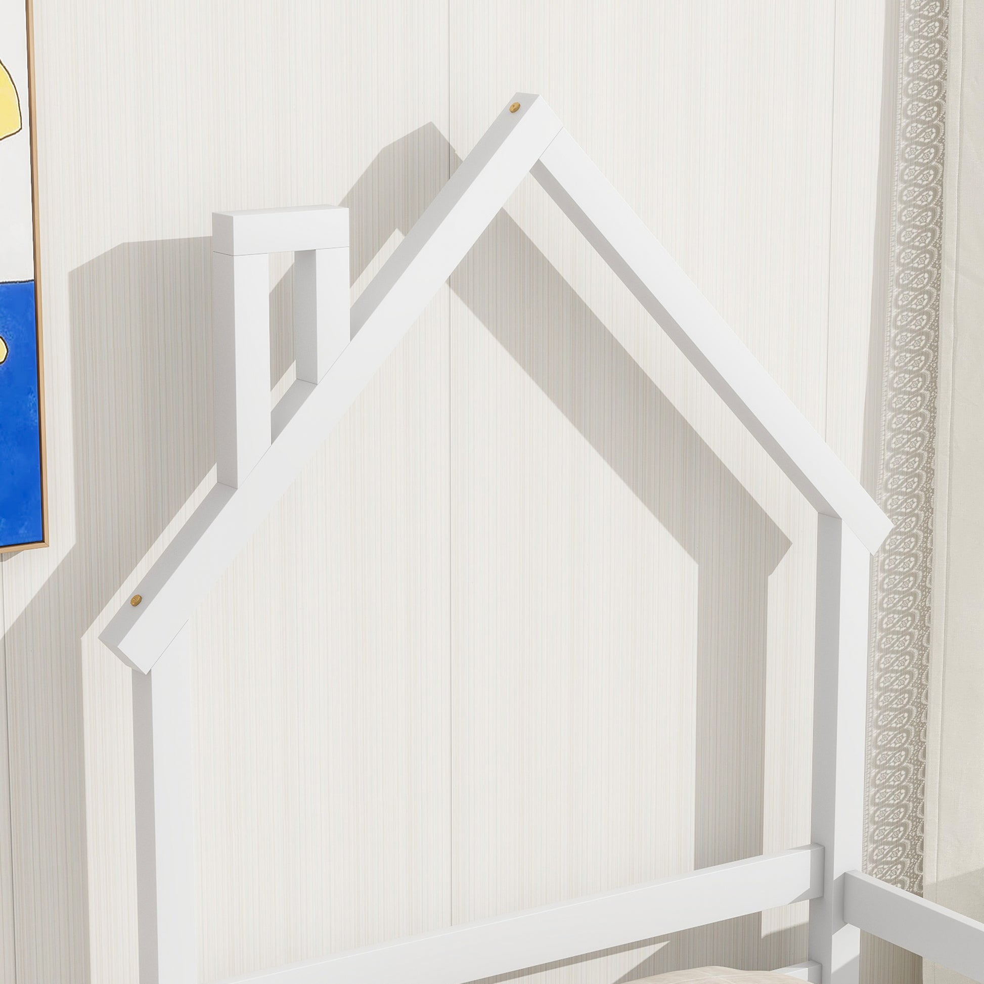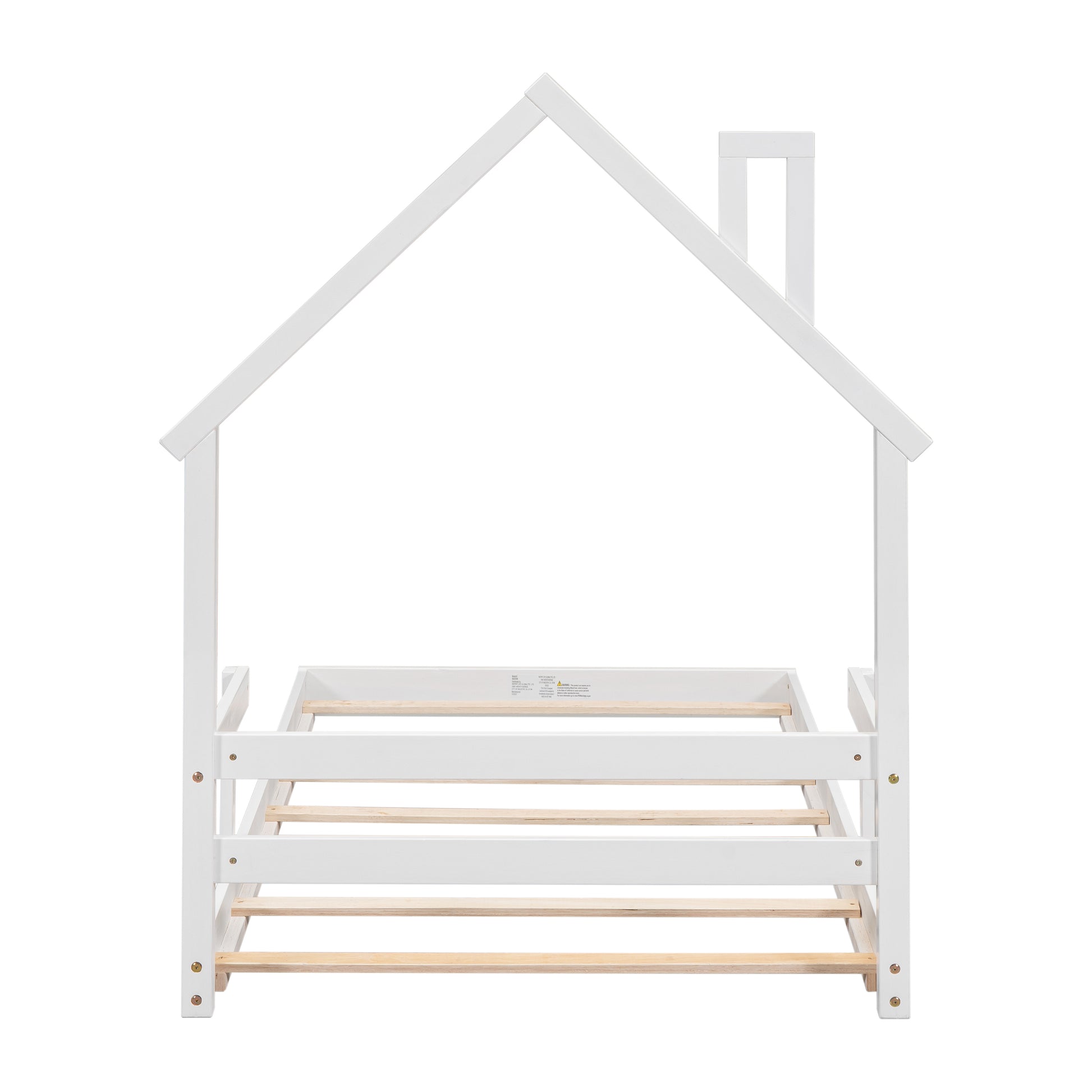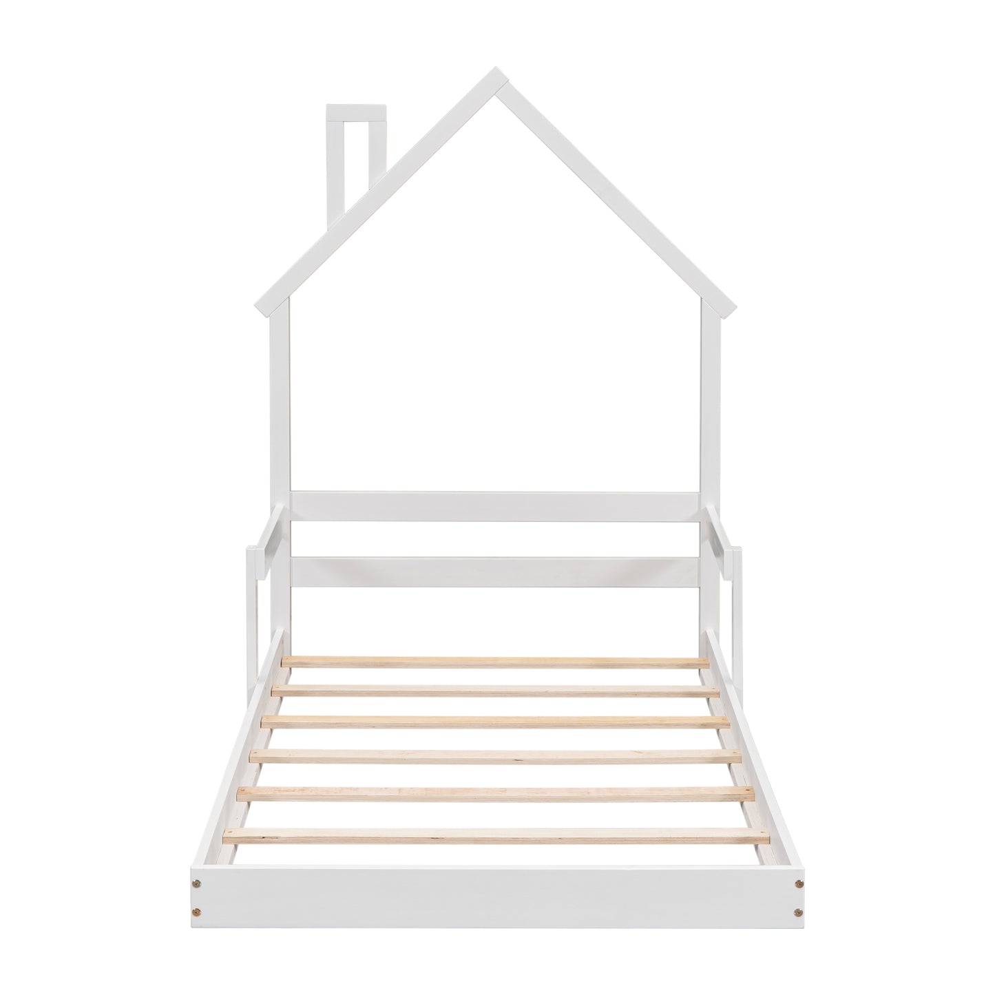Twin House-Shaped Headboard Floor Bed with Handrails ,slats,White