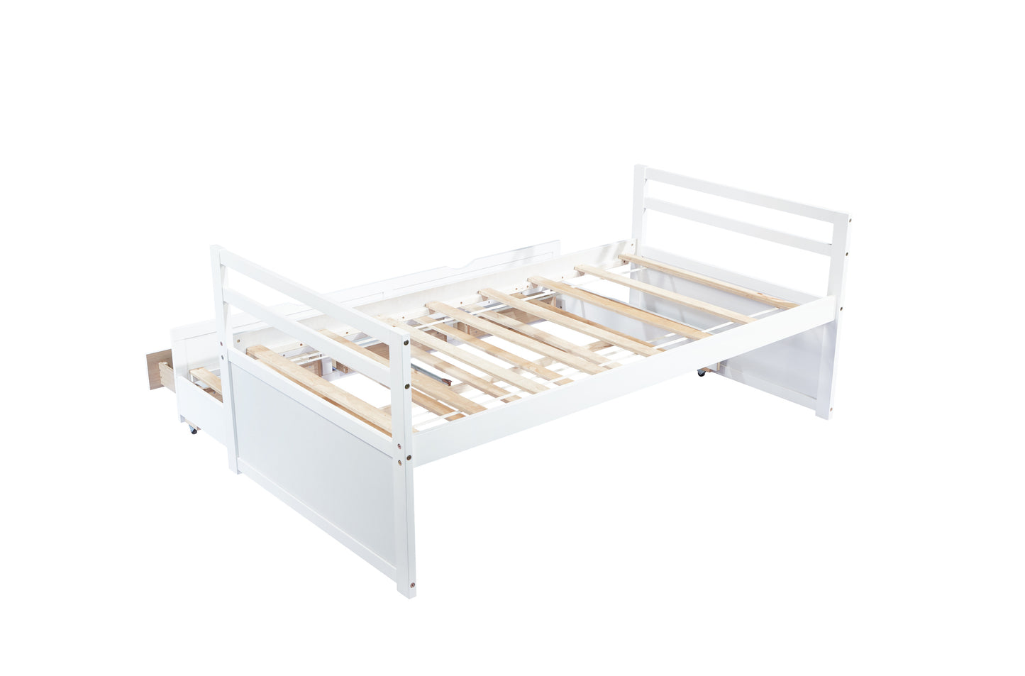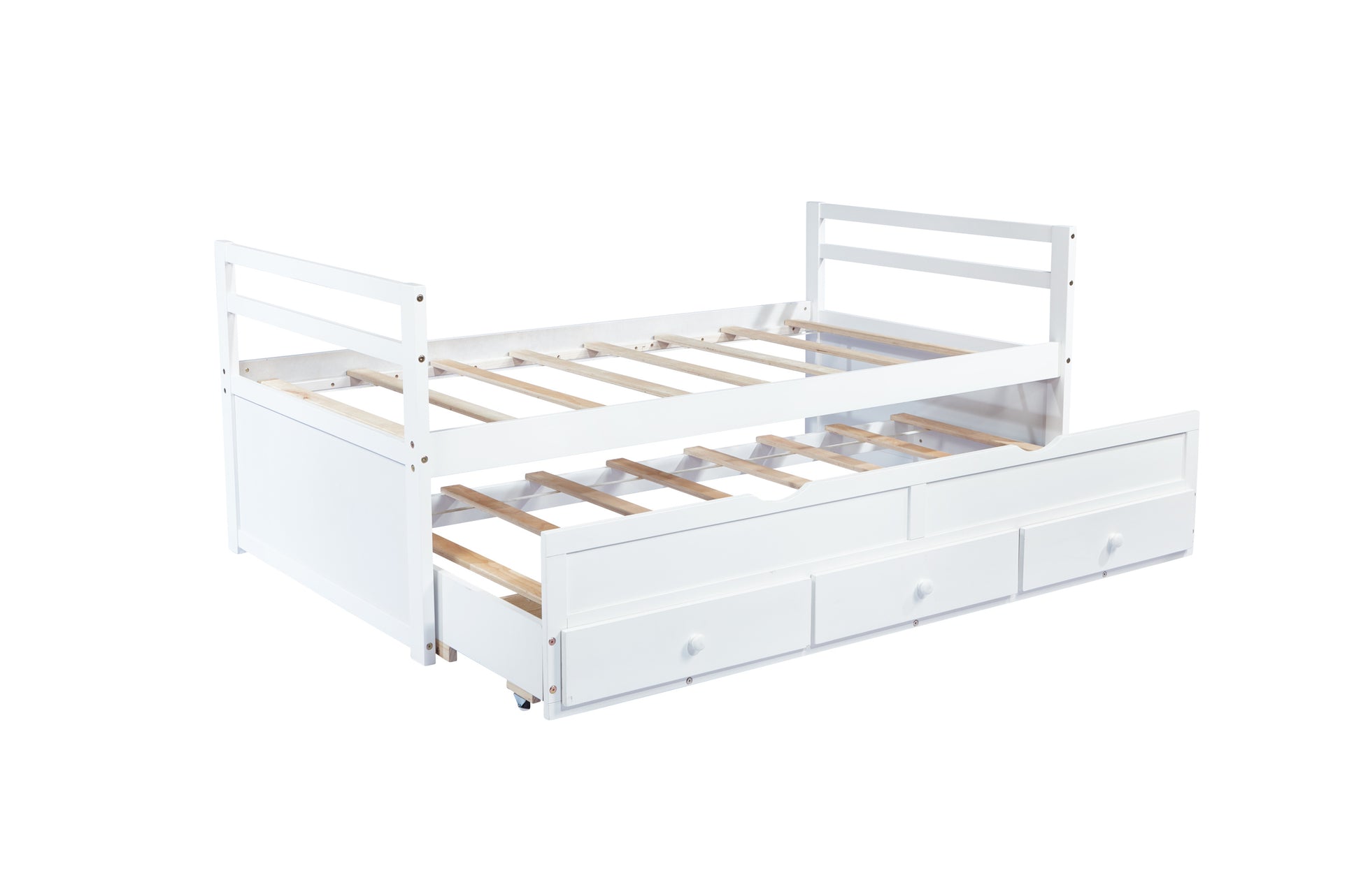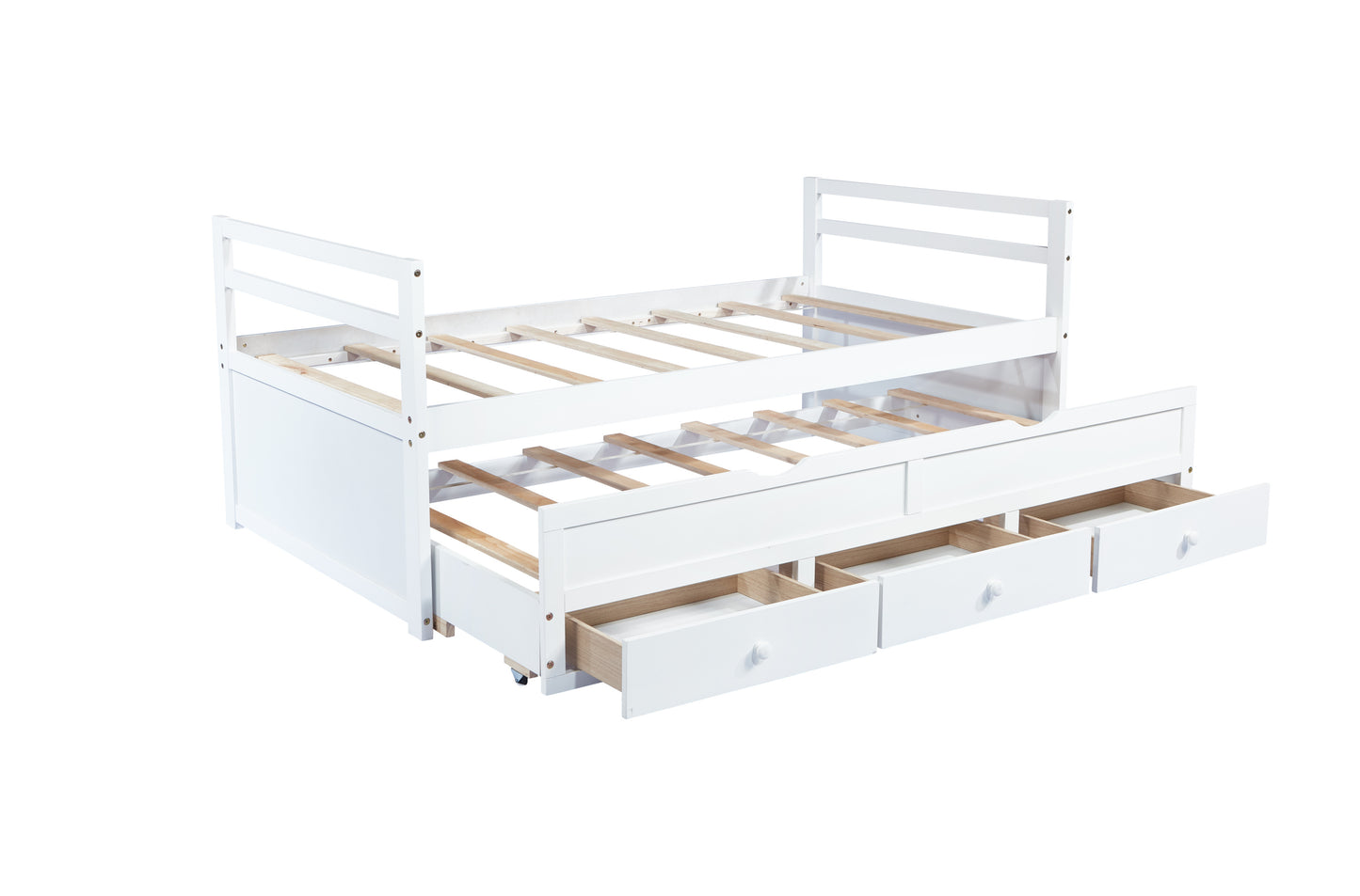 Twin Size Bed with Headboard, Footboard, Trundle and Three Storage Drawers, Twin Size Pine Wood Bed with Headboard, Footboard,White