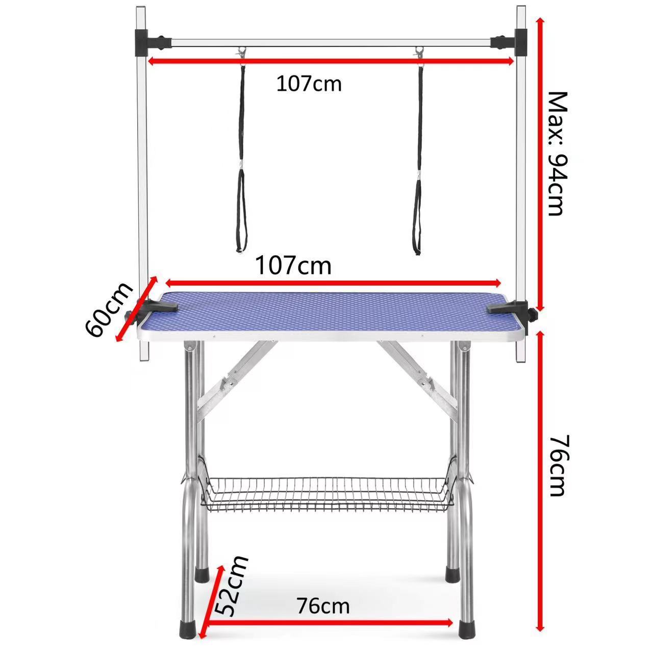 NEW HIGH QUALITY FOLDING PET GROOMING TABLE STAINLESS LEGS AND ARMS BLUE RUBBER TOP STORAGE BASKET
