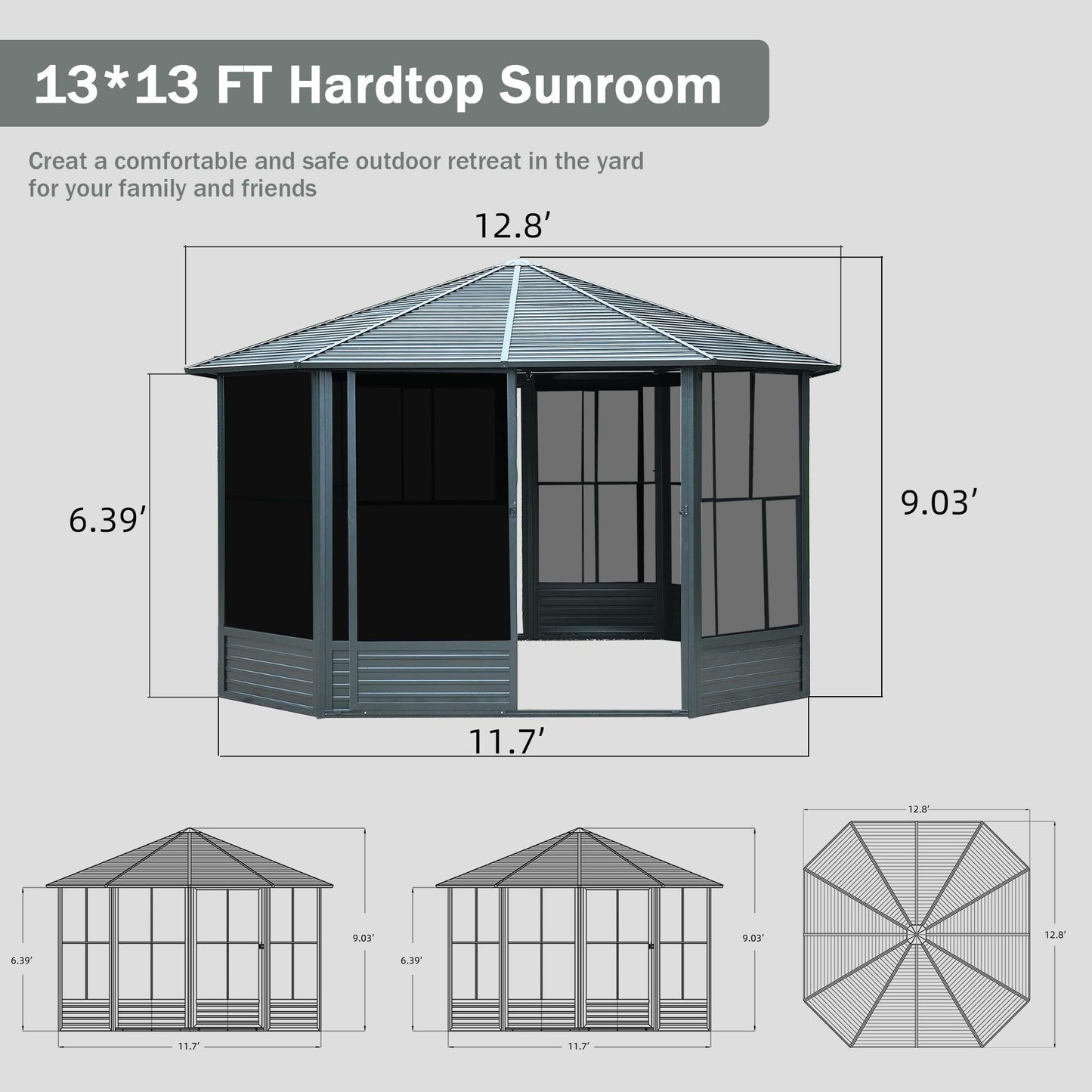 - Versatile Usage Sunroom - This outdoor sunroom solarium measures 13' L X 13' W x 9.03' H and it provide a perfect space for outdoor use, it can meet your different needs such as a little room, studio or lounge.