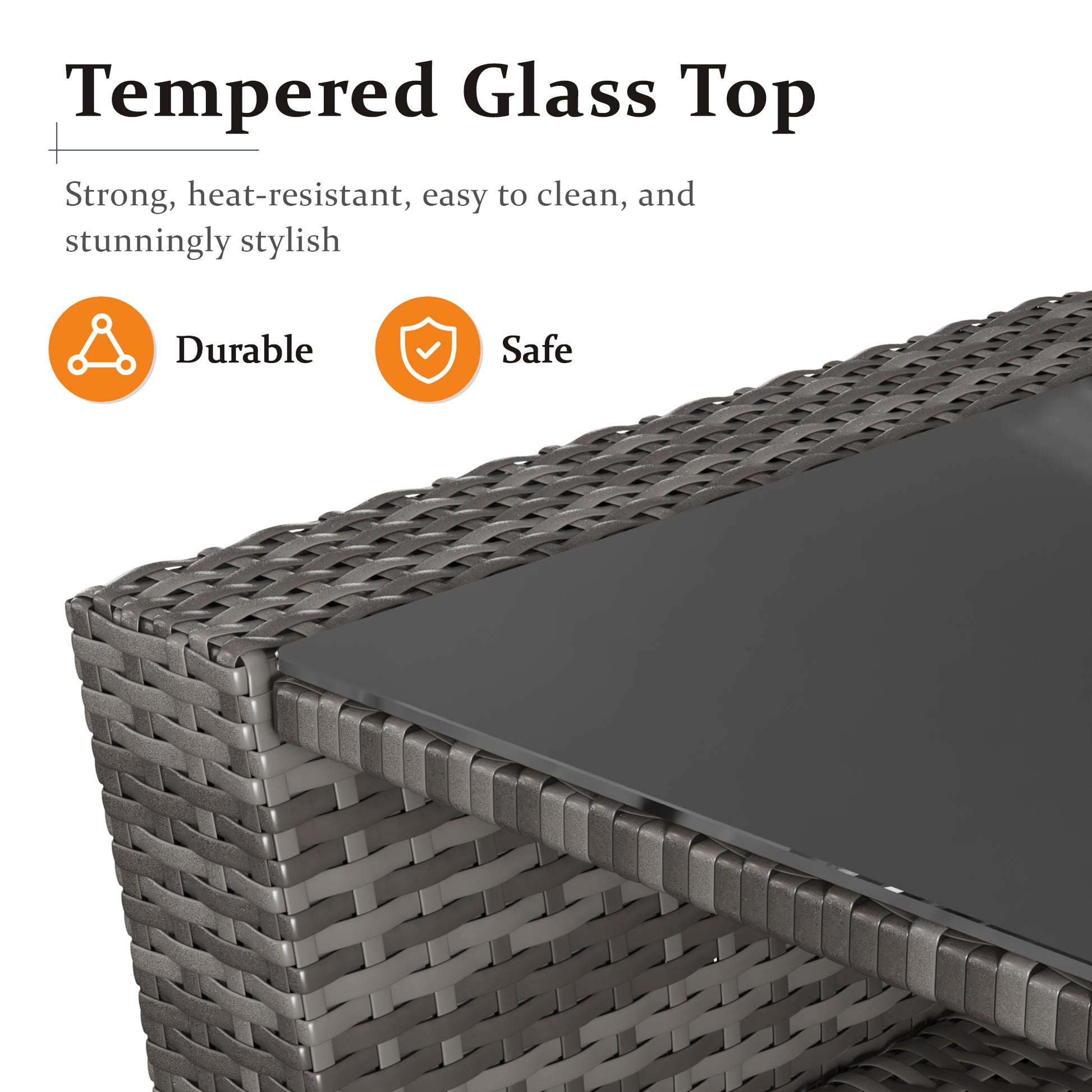 - Easy Cleaning: The cushion covers are equipped with a zipper for quick removal. Both steel frame and PE rattan wicker are splash-proof, ensuring easy maintenance. Keep the tempered glass tabletop looking fresh by wiping it down with a wet towel.