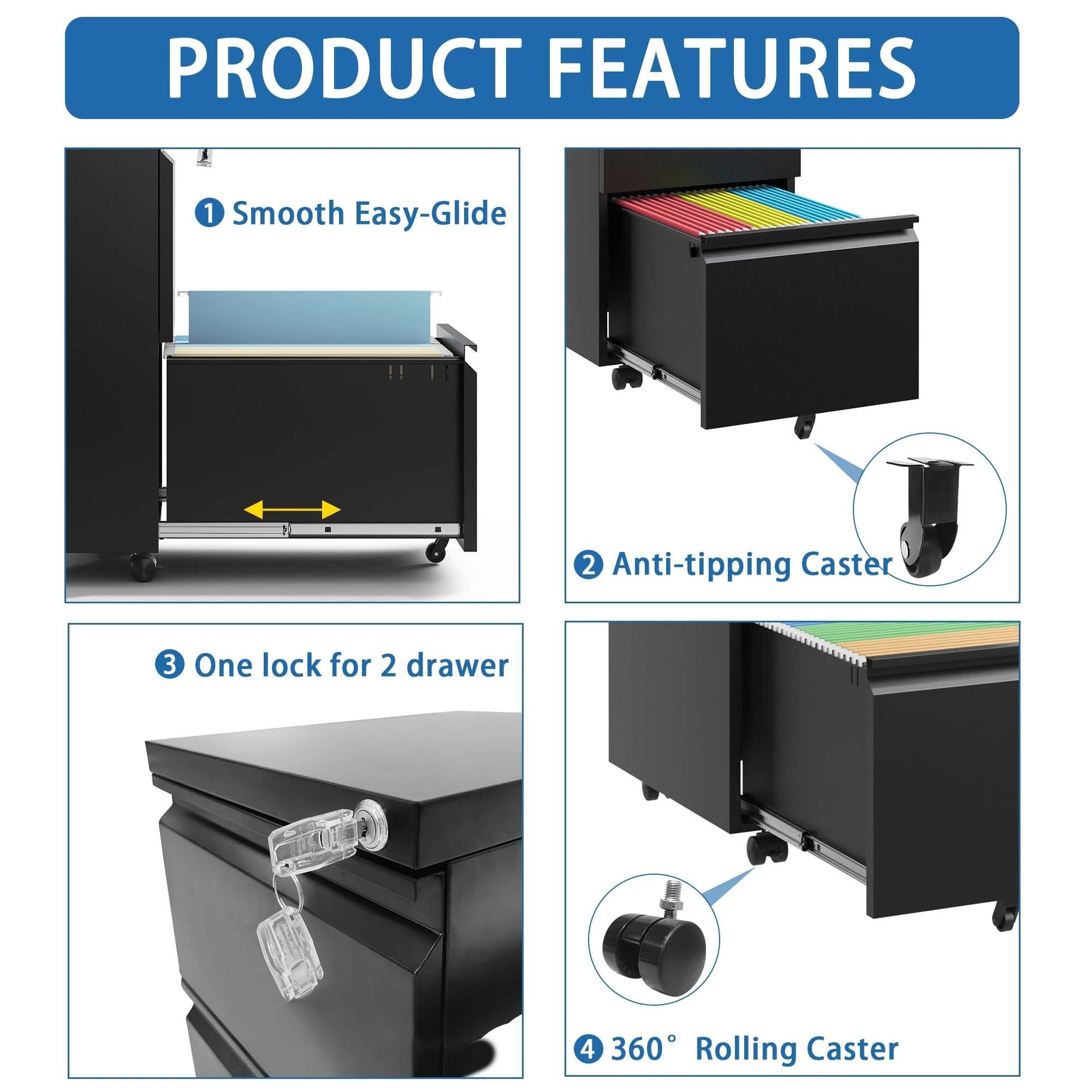 - Add More Mobility: This file cabinet comes with five casters, including two front casters with braking function and one center caster to prevent tipping, providing added mobility and stability.