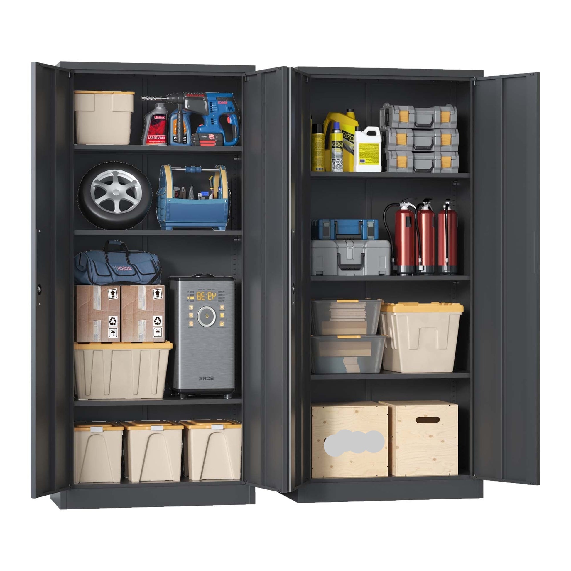 - Multipurpose Large Cabinet: Versatile lockable garage organization cabinet with 2 doors and 3 adjustable shelves. Accommodate various items effortlessly, each layer supporting up to 180 pounds. Ideal for home offices, utility rooms, garages, schools, and businesses.