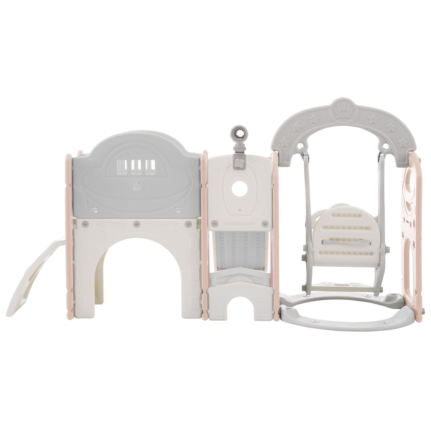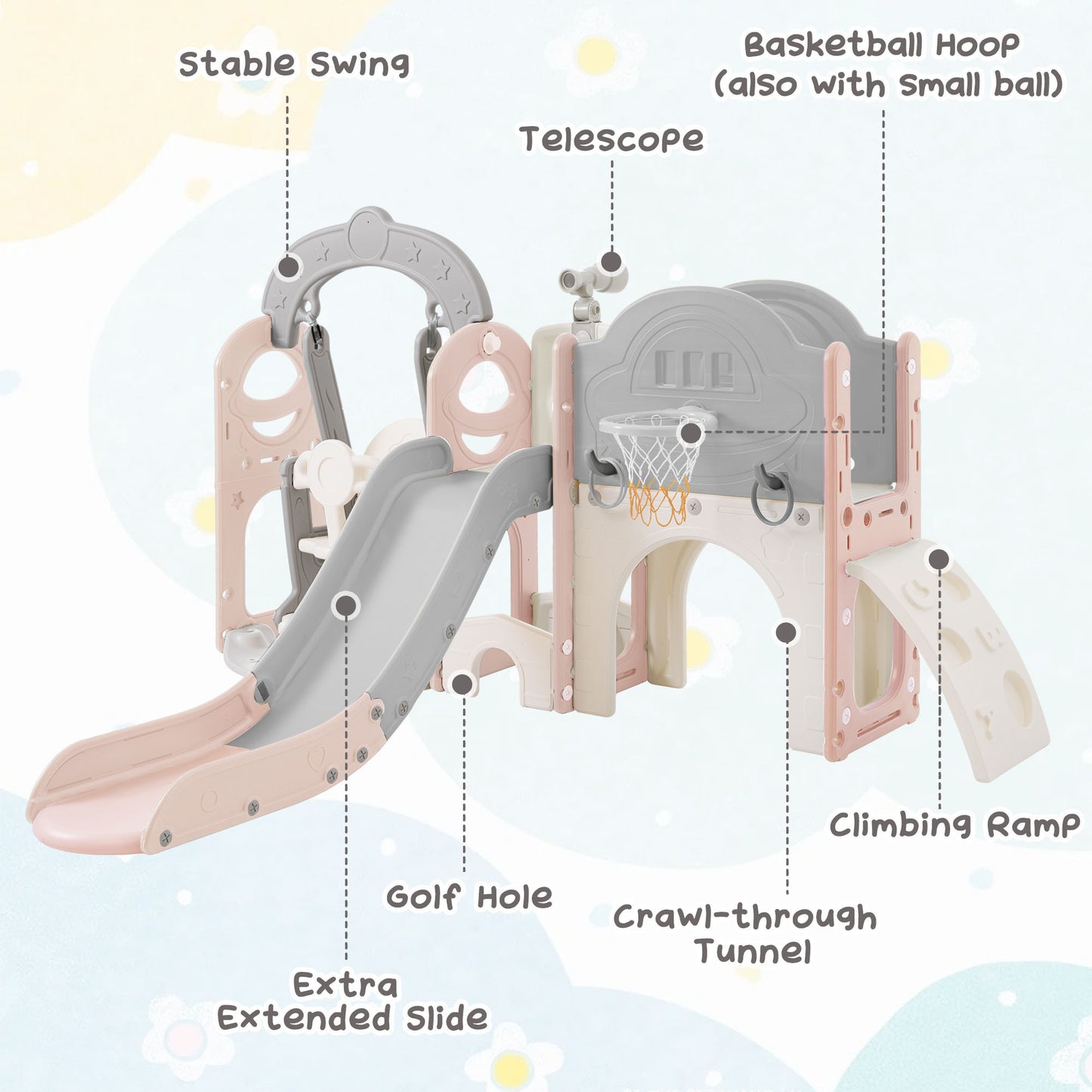 - [Children's Playground 8-in1] Refreshing styling design! Delicate and cute freestanding swing and slide set for toddlers with five functional parts: 1 slide, 1 climbing ramp, 1 swing, 1 basketball hoop, 2 golf holes,1 telescope, ring toss game and 1 crawl-through tunnel. This set allows children to completely release their playful nature, and they can play with their friends for hours!