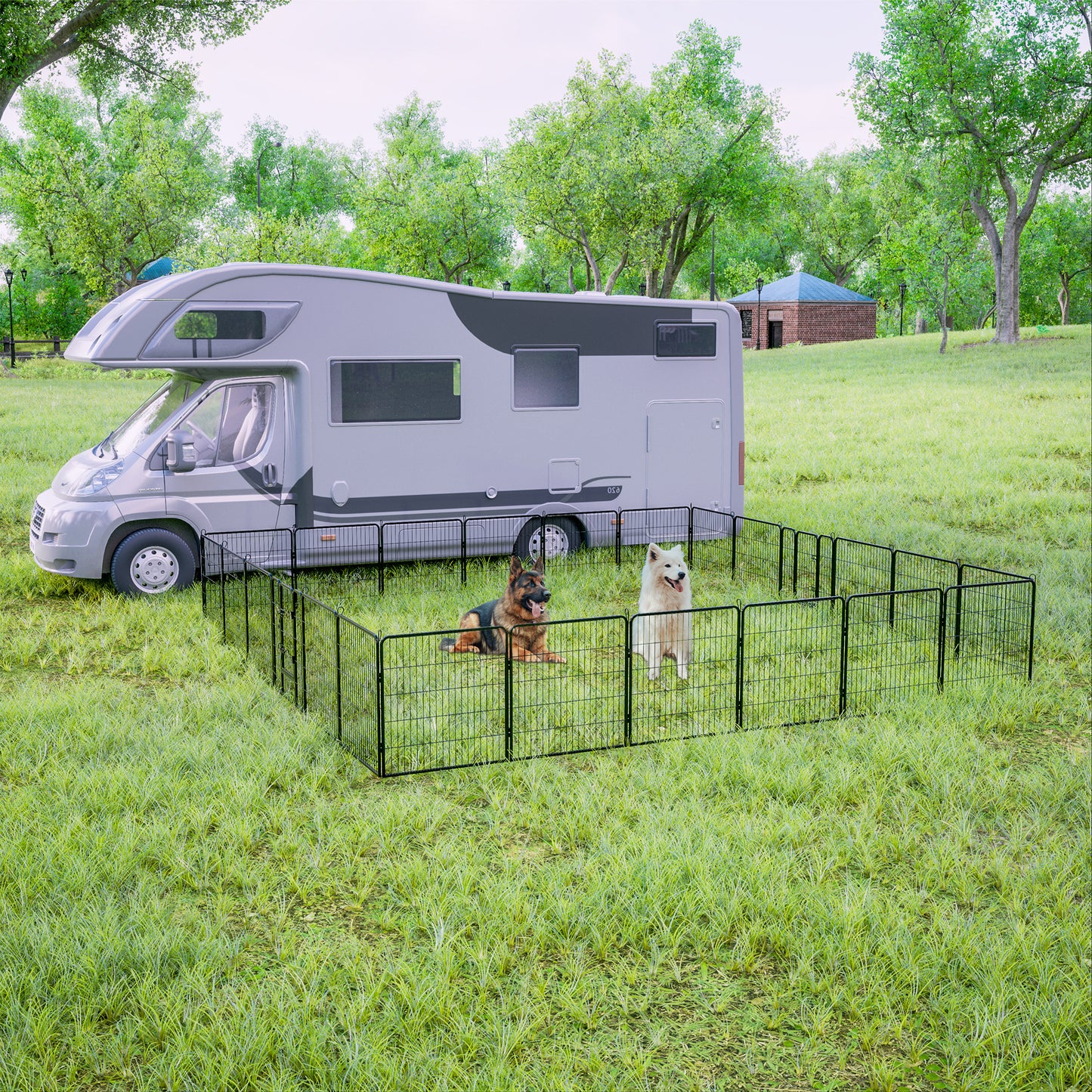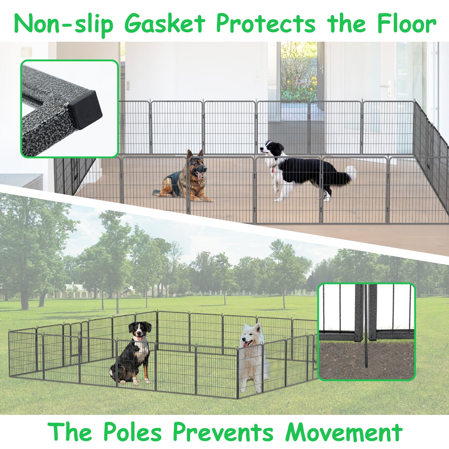 - Durable & Premium Material:The dog playpen for large dogs is made of high quality wrough iron and features double-coated finish that makes it highly rust-resistant and waterproof, ideal for RV camping, traveling, or use in the yard. The dog fence with protective pads on each panel and flat stakes make it suitable to use indoor. Perfect indoor and outdoor dog play pen for resting and playing.