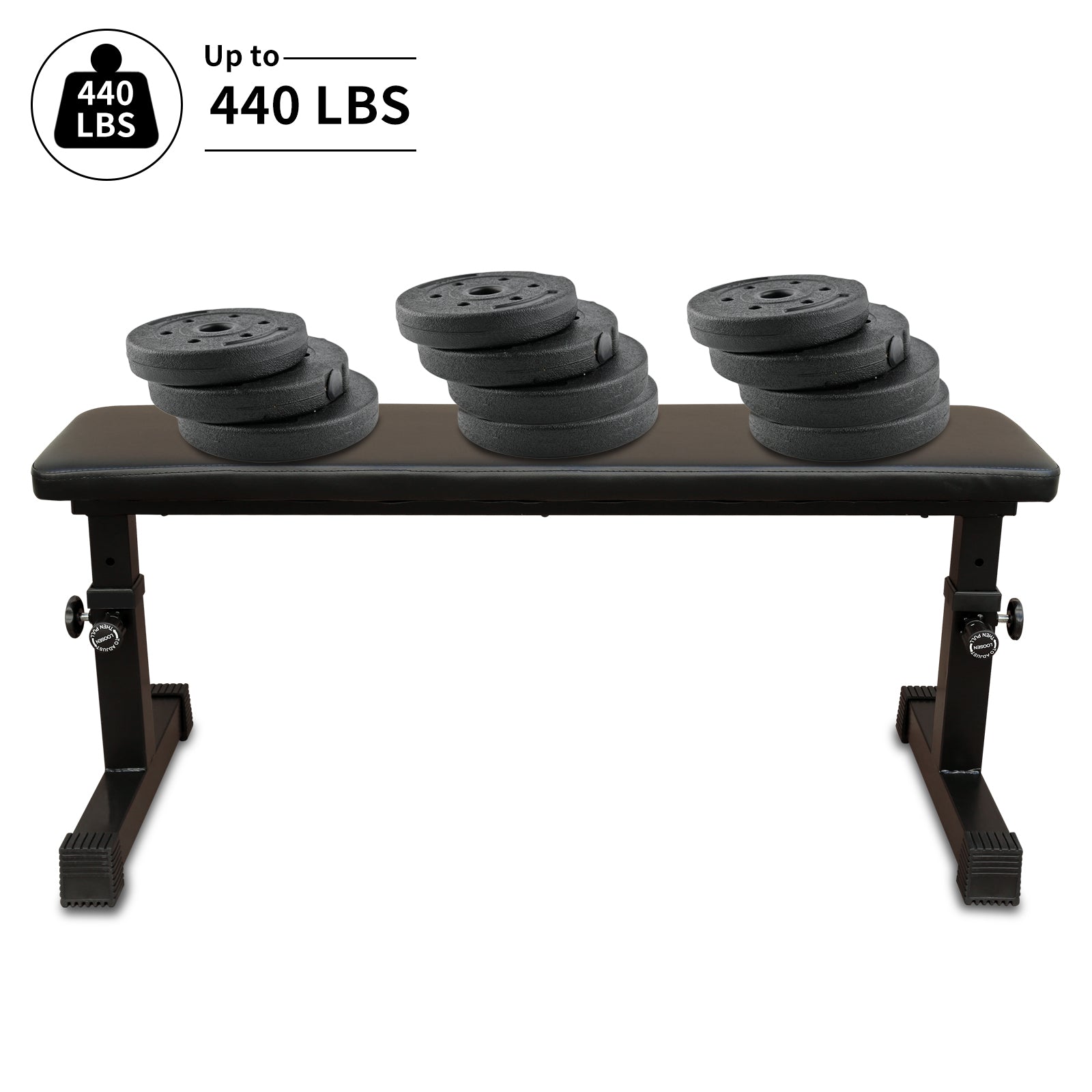 - The flat weight bench has been professionally tested and has a weight of 440 lbs.