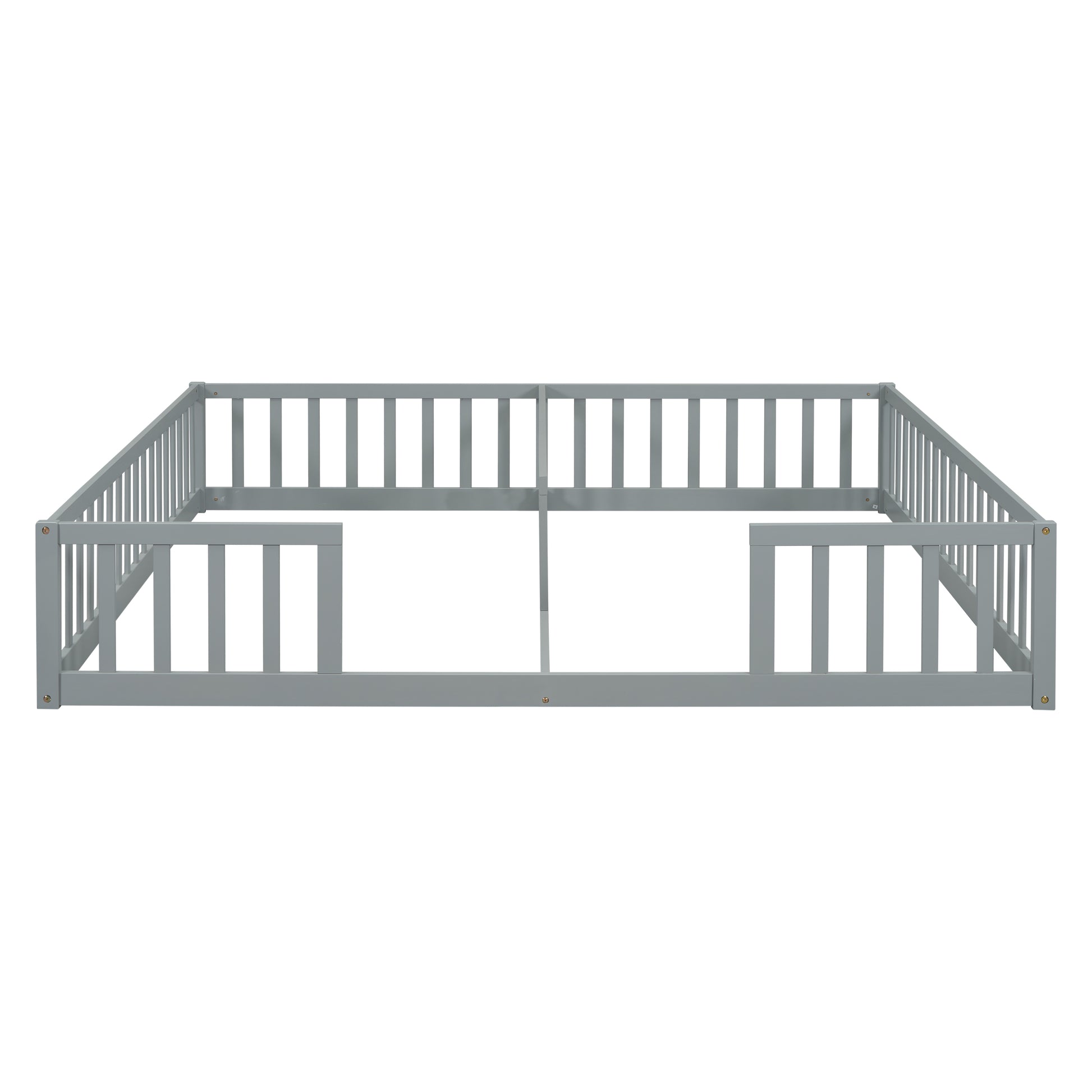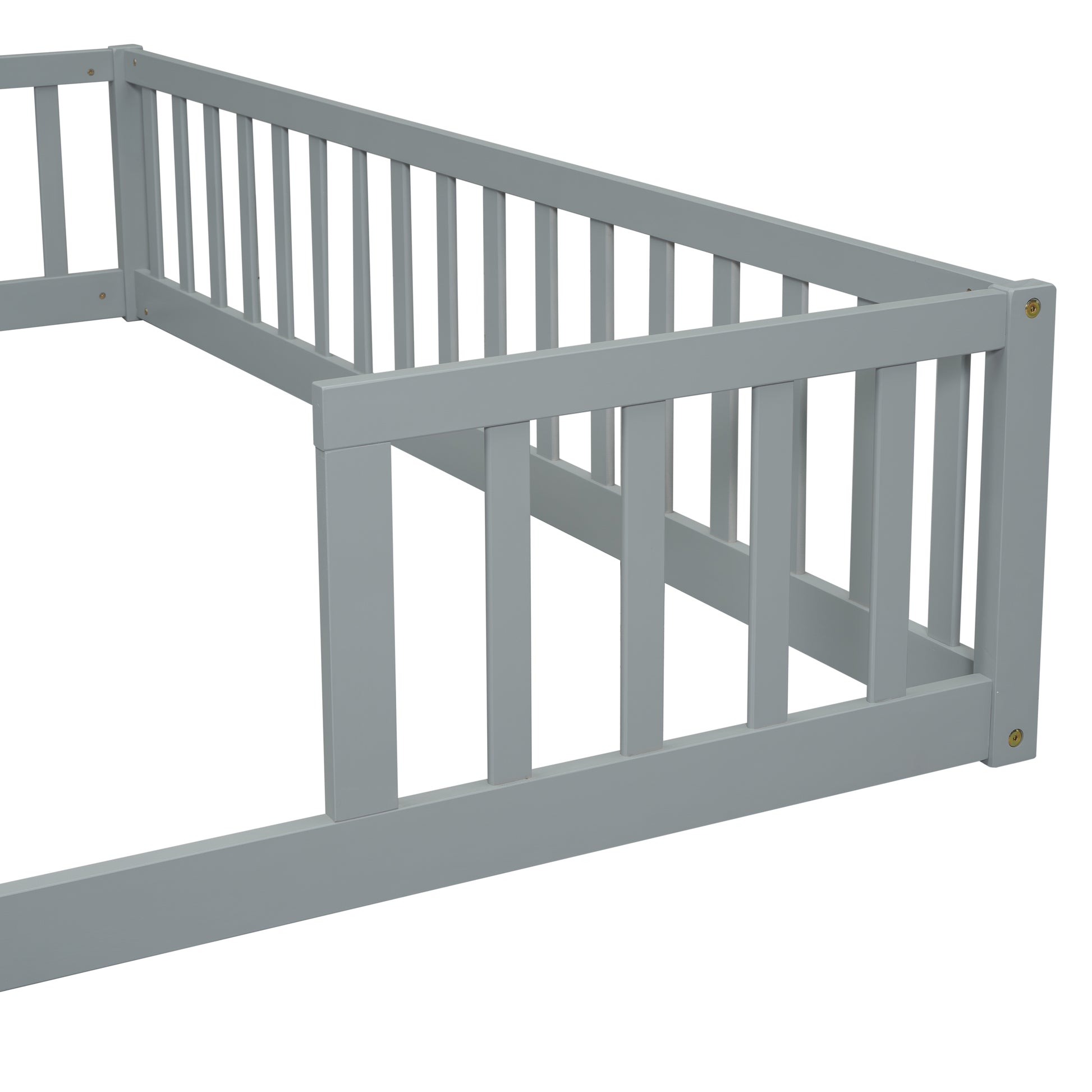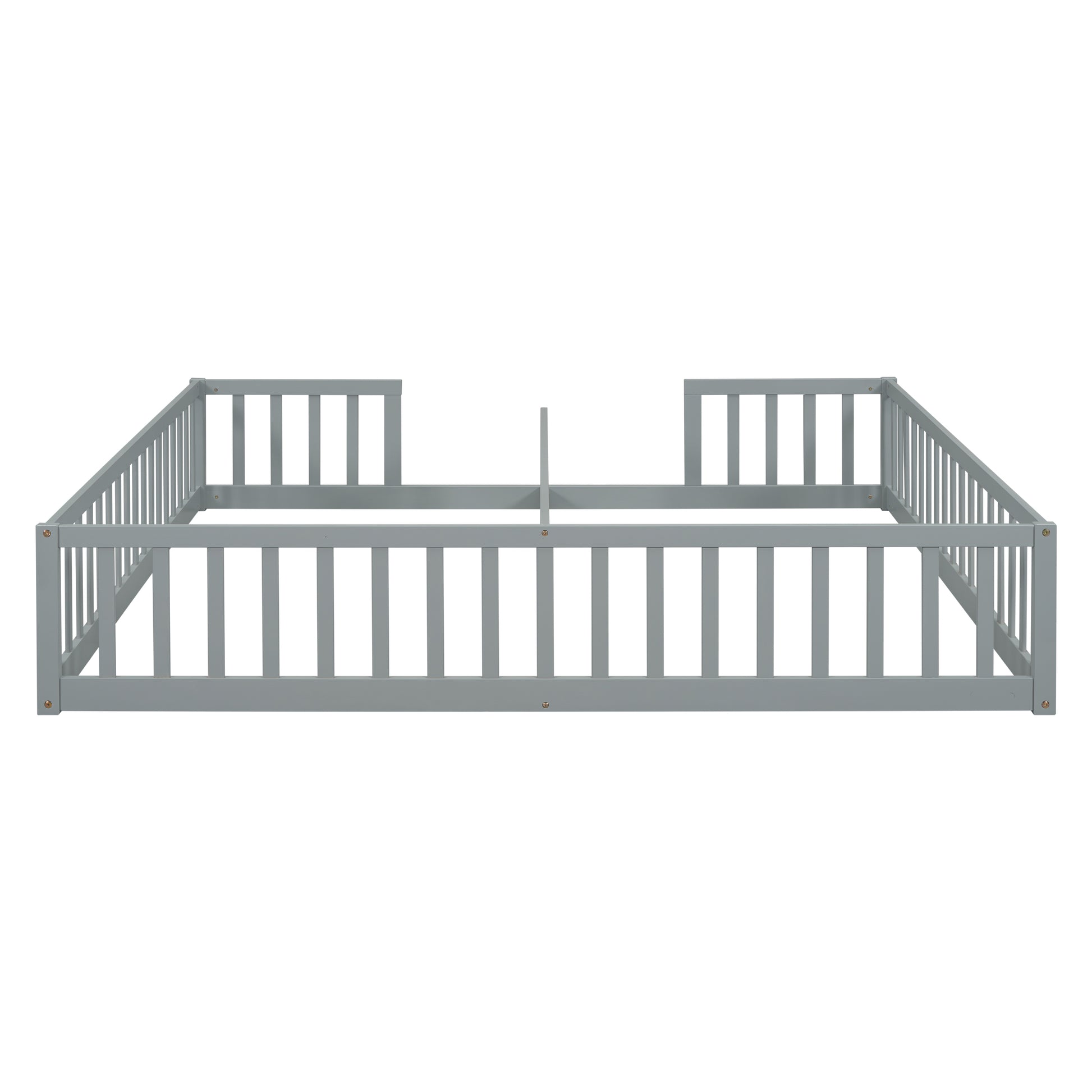 Double Twin Floor Bed with Fence, Guardrails, without door, Grey