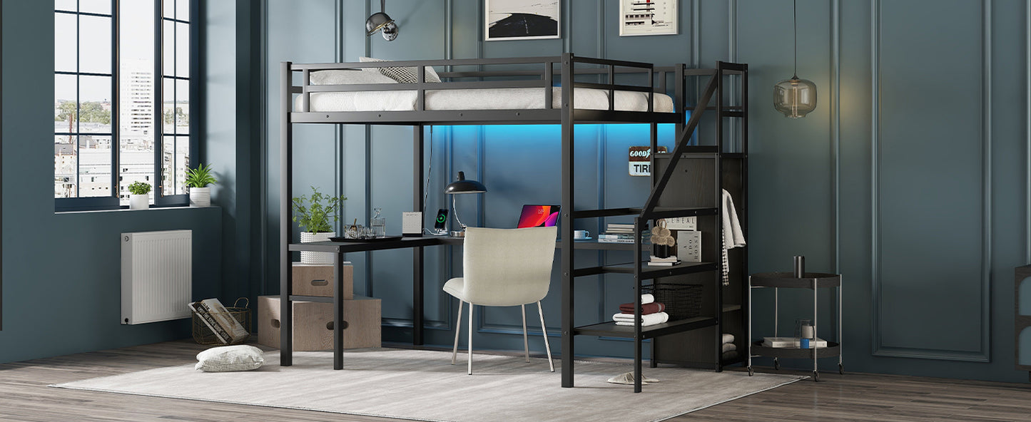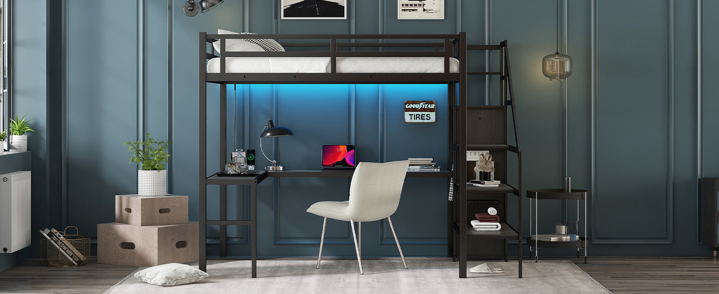 - Loft Bed with USB and LED - The full size bed's desk comes with a USB charging station for charging electronics that is convenience to your daily life.The LED light strip adds a sense of ambiance to your room while making it easy for you to wake up at night.