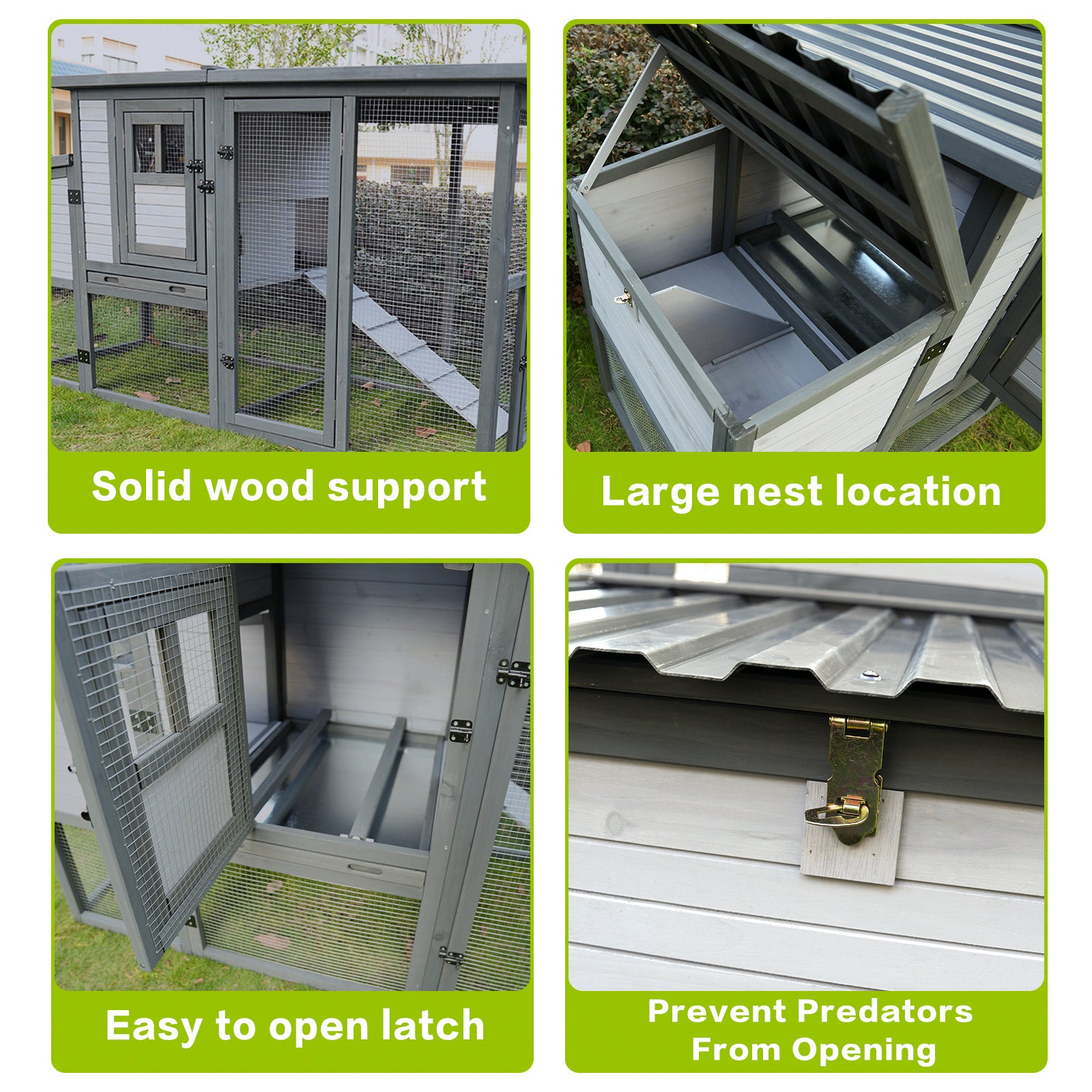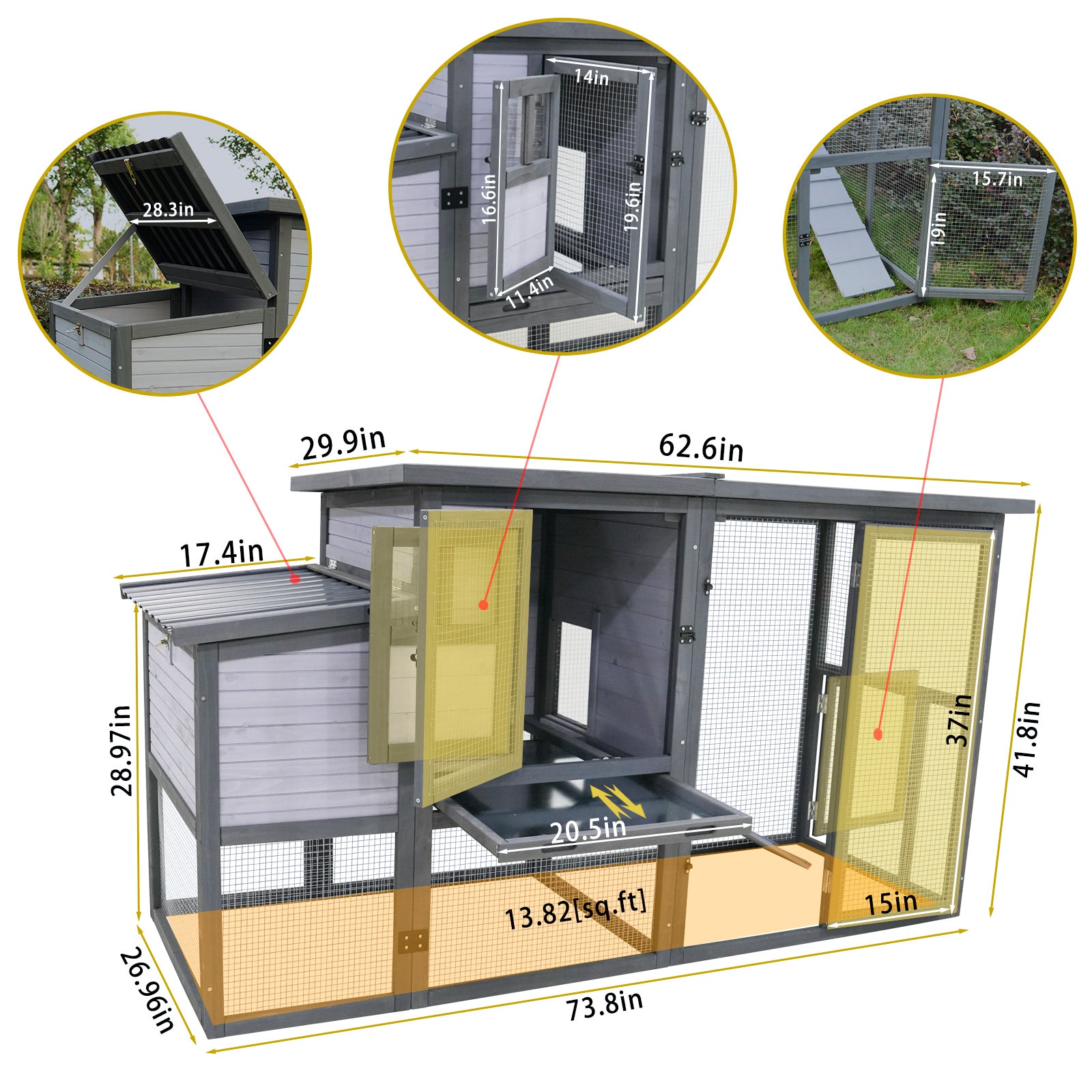 - Overall size: 78.7"L x 28"W x 42"H,Include nesting box,sleeping and Large running area, suitable for 5-8 chickens,ducks.