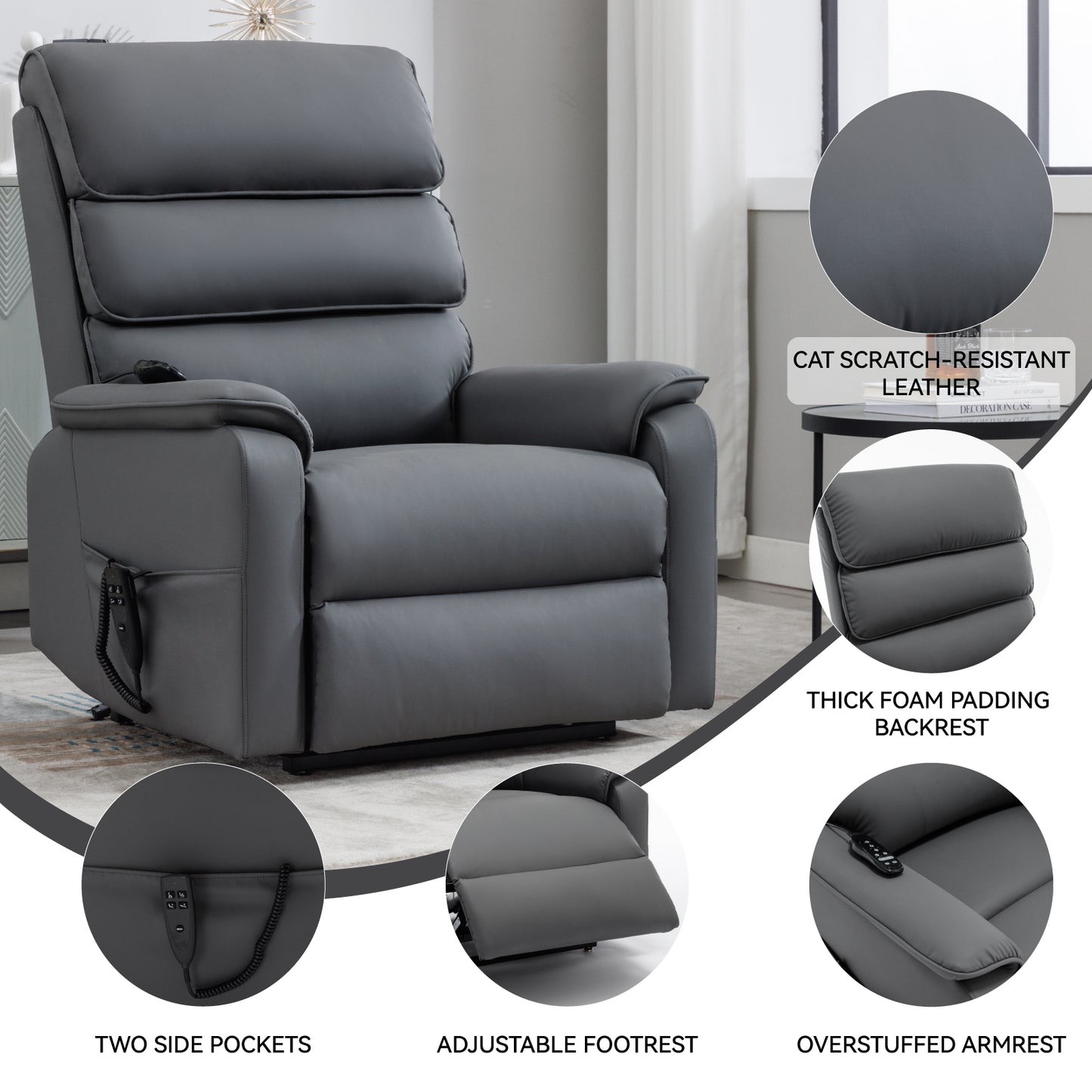 Grey Cat-proof Leather Dual Motor Infinite Position Up to 350 LBS Power Lift Recliner Chair with Power-Remote, Heat Massage and Heavy Duty Motion Mechanism
