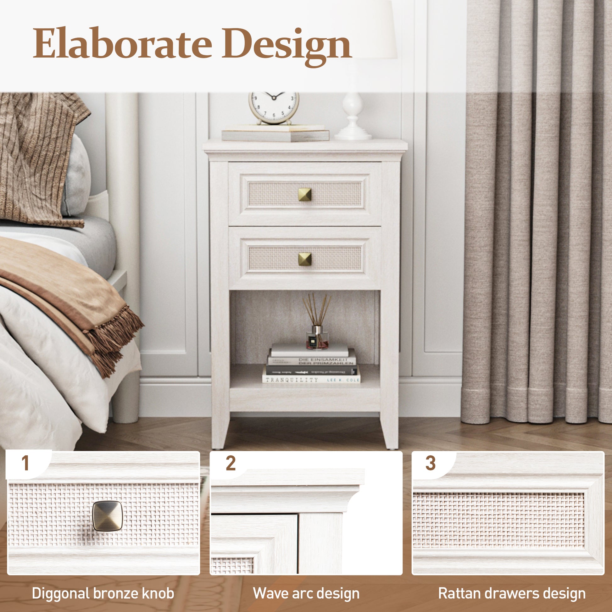 Farmhouse Nightstand, Boho Bedside Table with 2 Rattan Decor Drawers, Accent End Table with Open Storage Shelf
