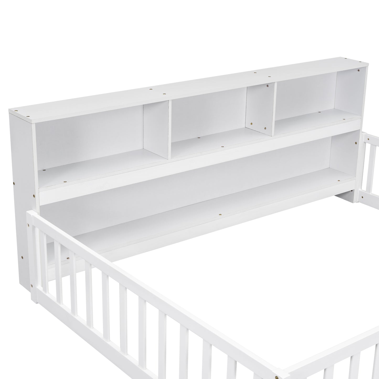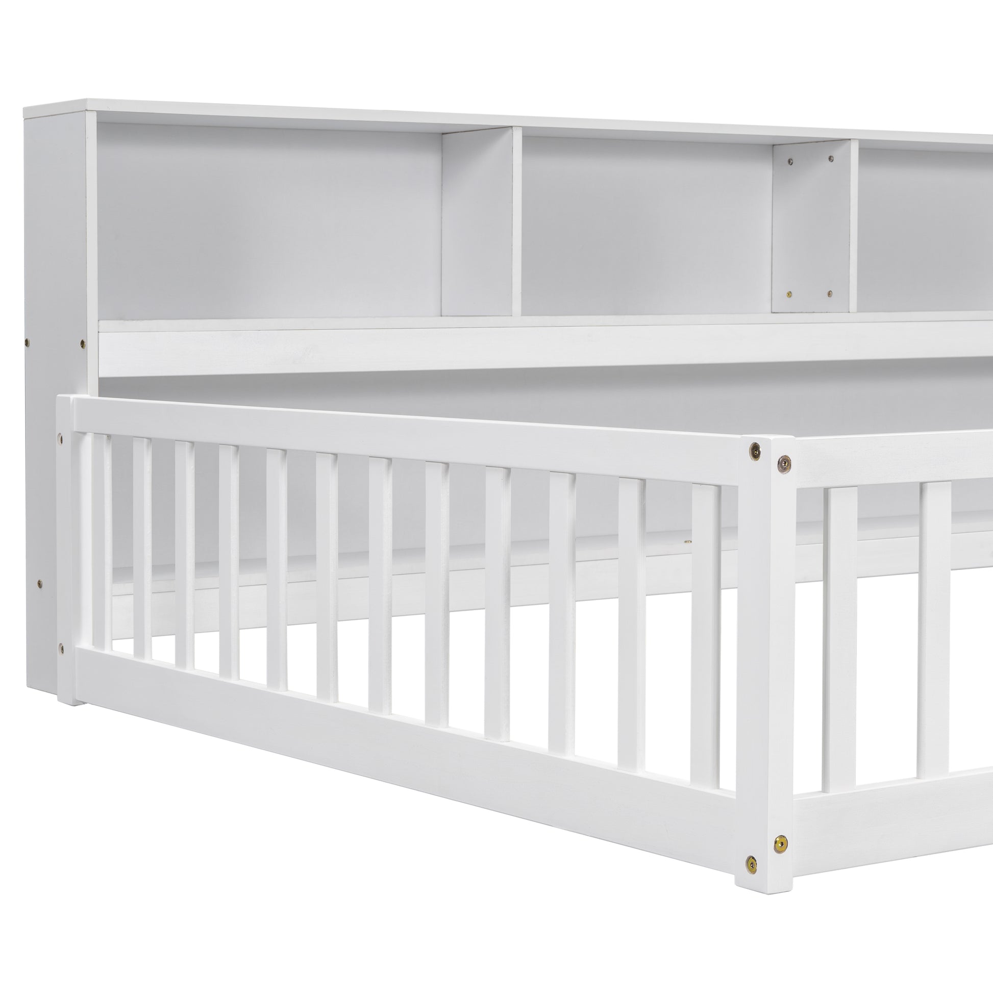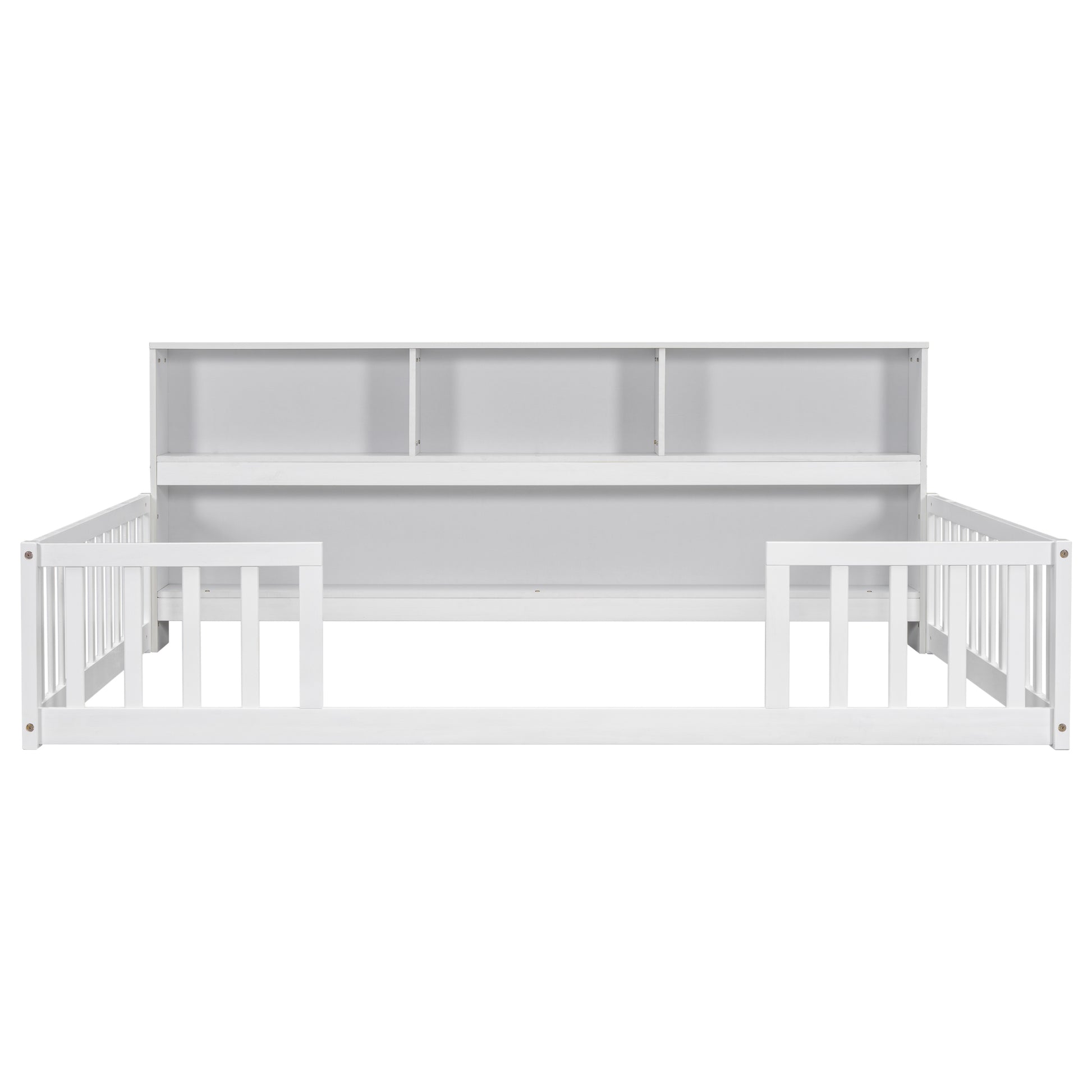 Full Floor Bed with Side Bookcase,Shelves,Guardrails,White