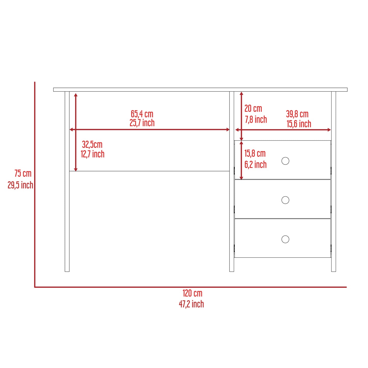 Bianco Writing Computer Desk, Three Drawers, One Shelf