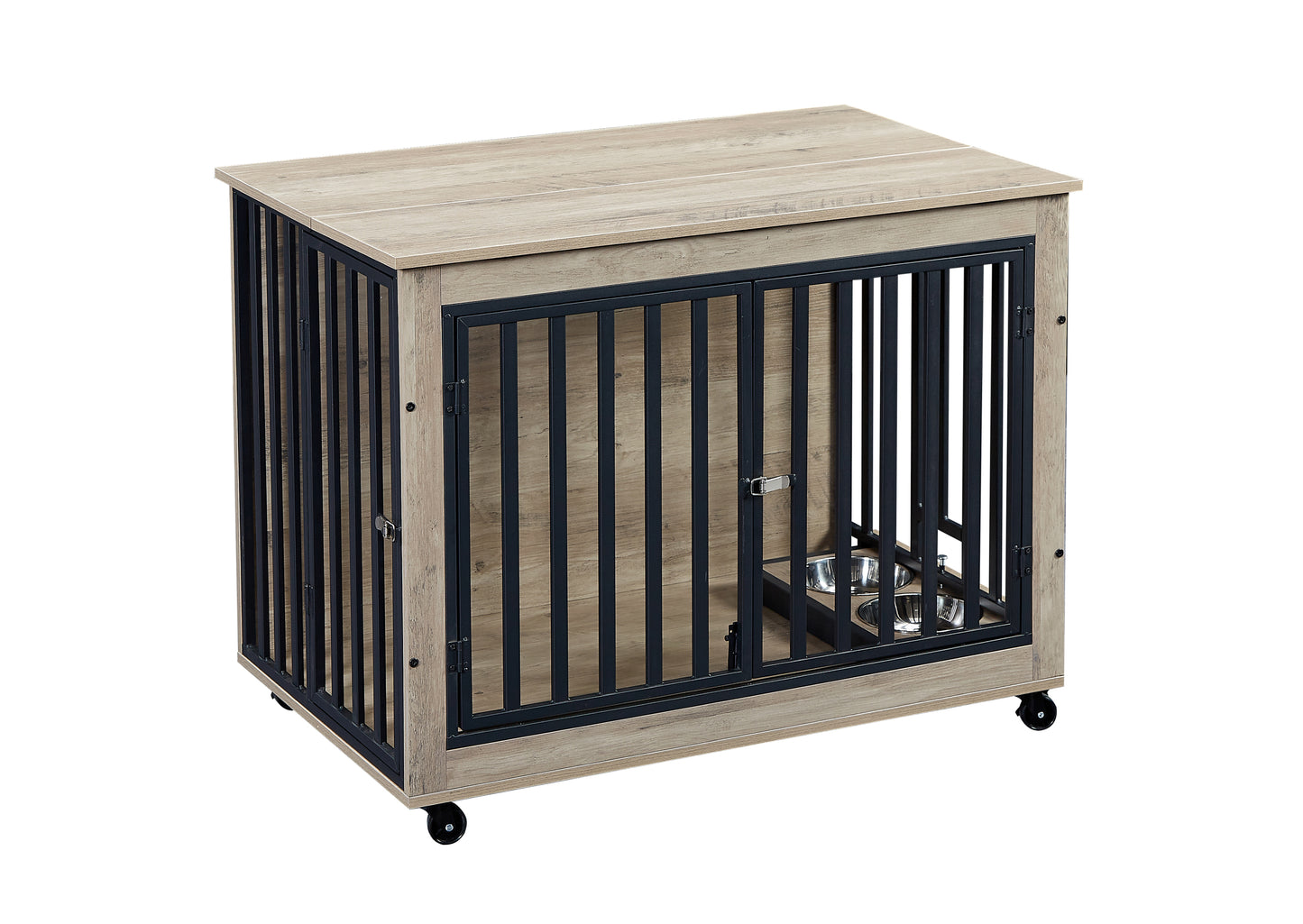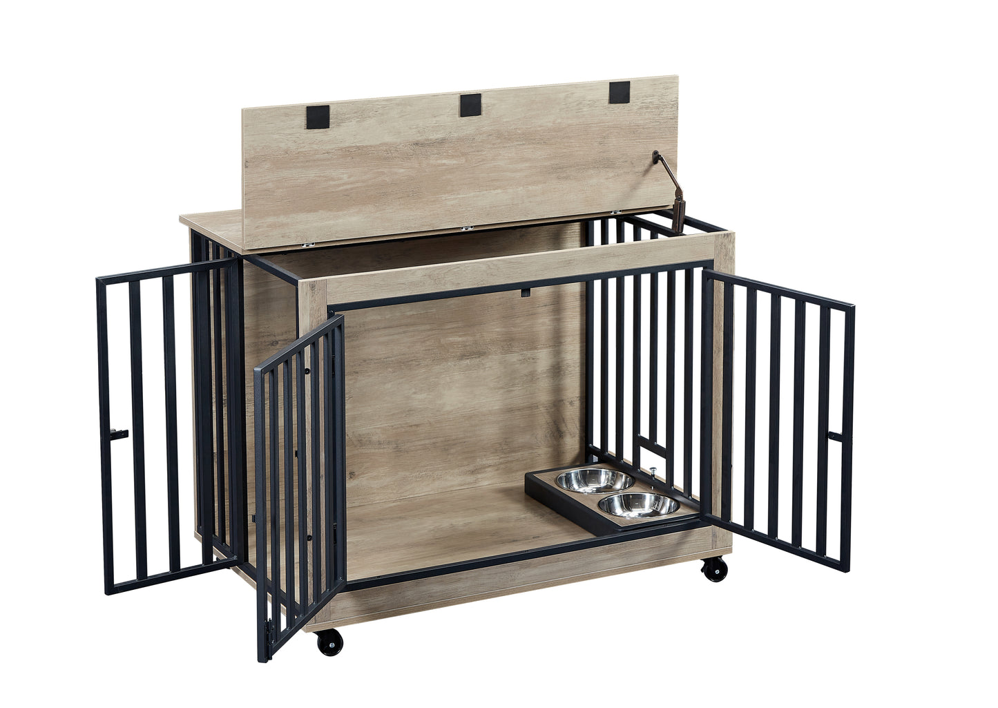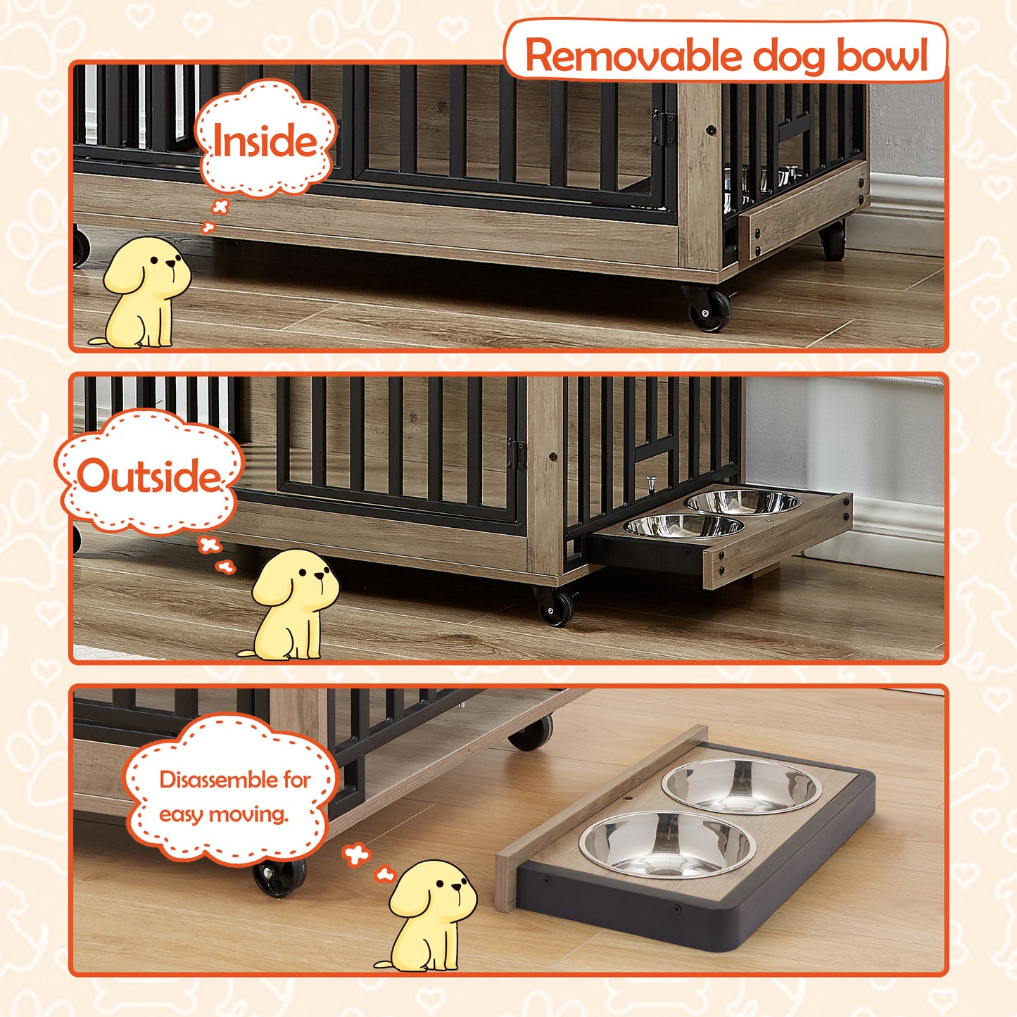 Furniture Style Dog Crate Side Table With Feeding Bowl, Wheels, Three Doors, Flip-Up Top Opening. Indoor, Grey, 38.58"W x 25.2"D x 27.17"H