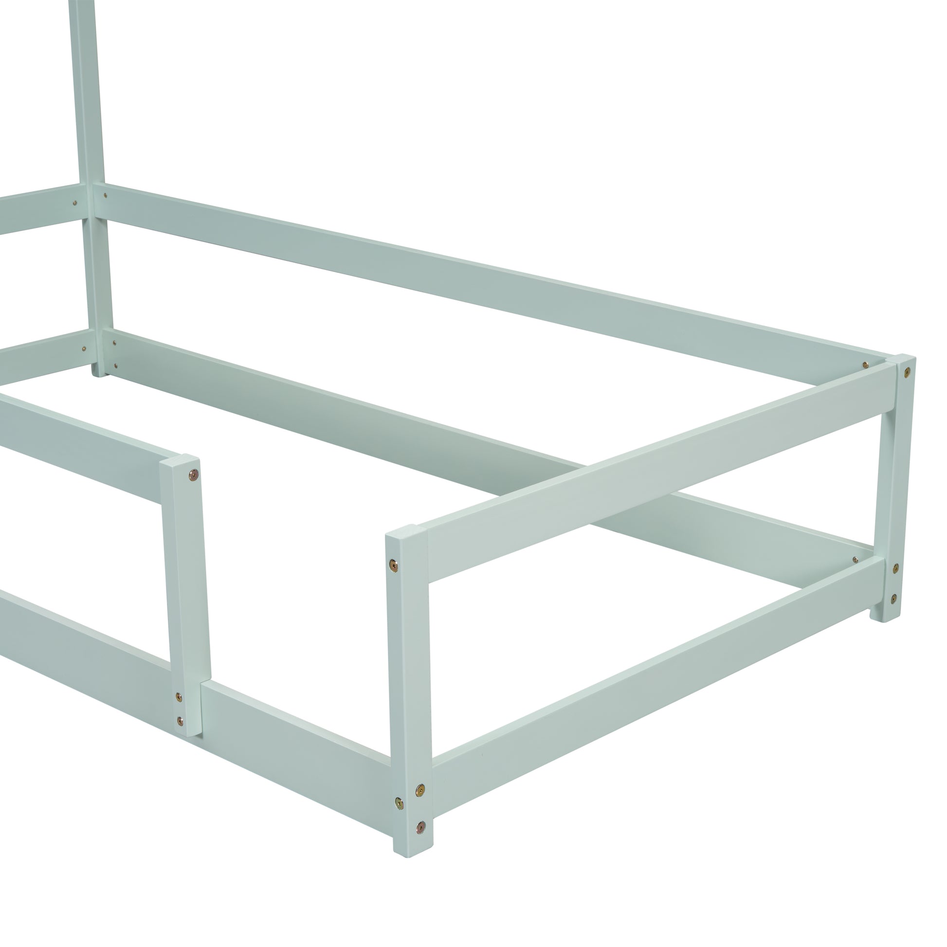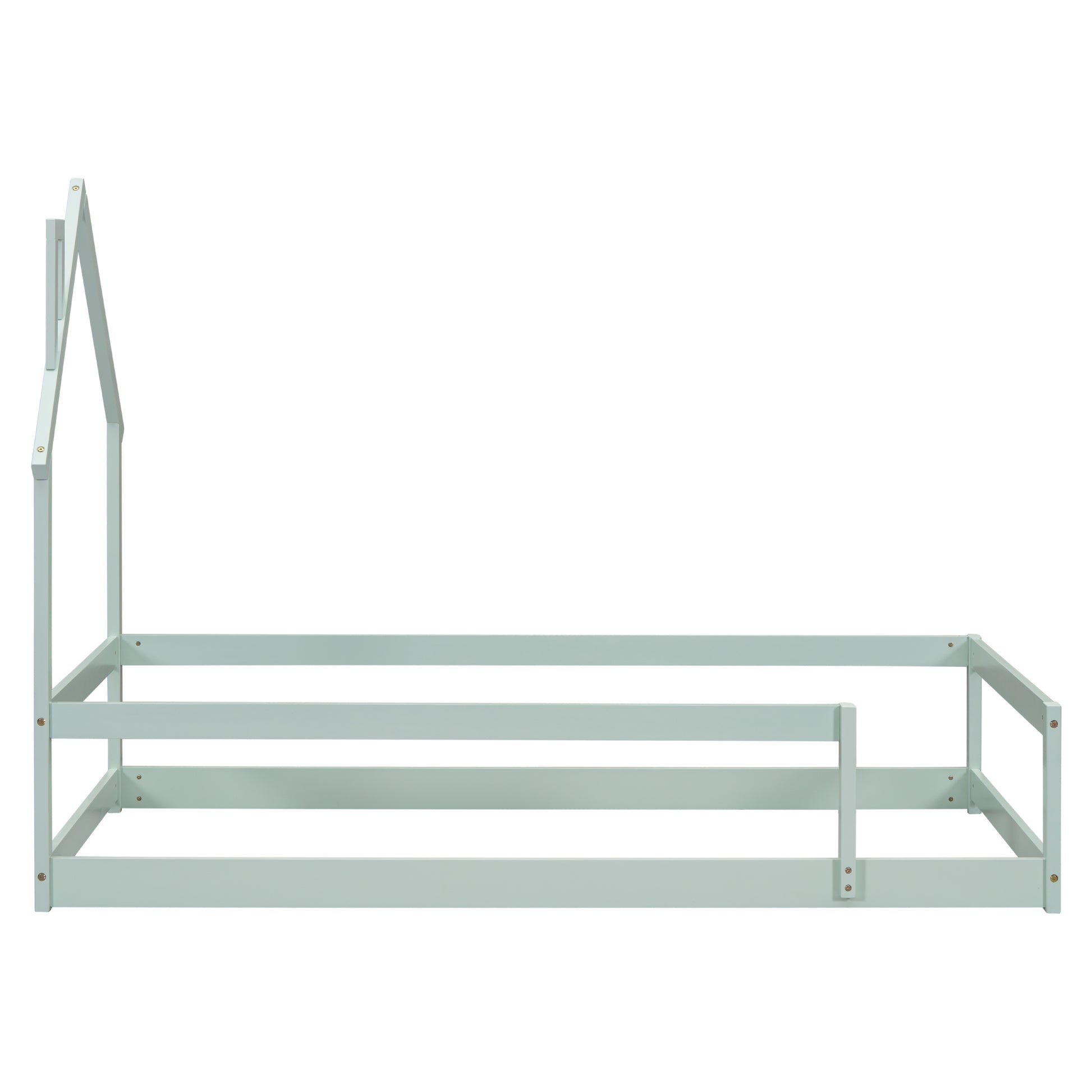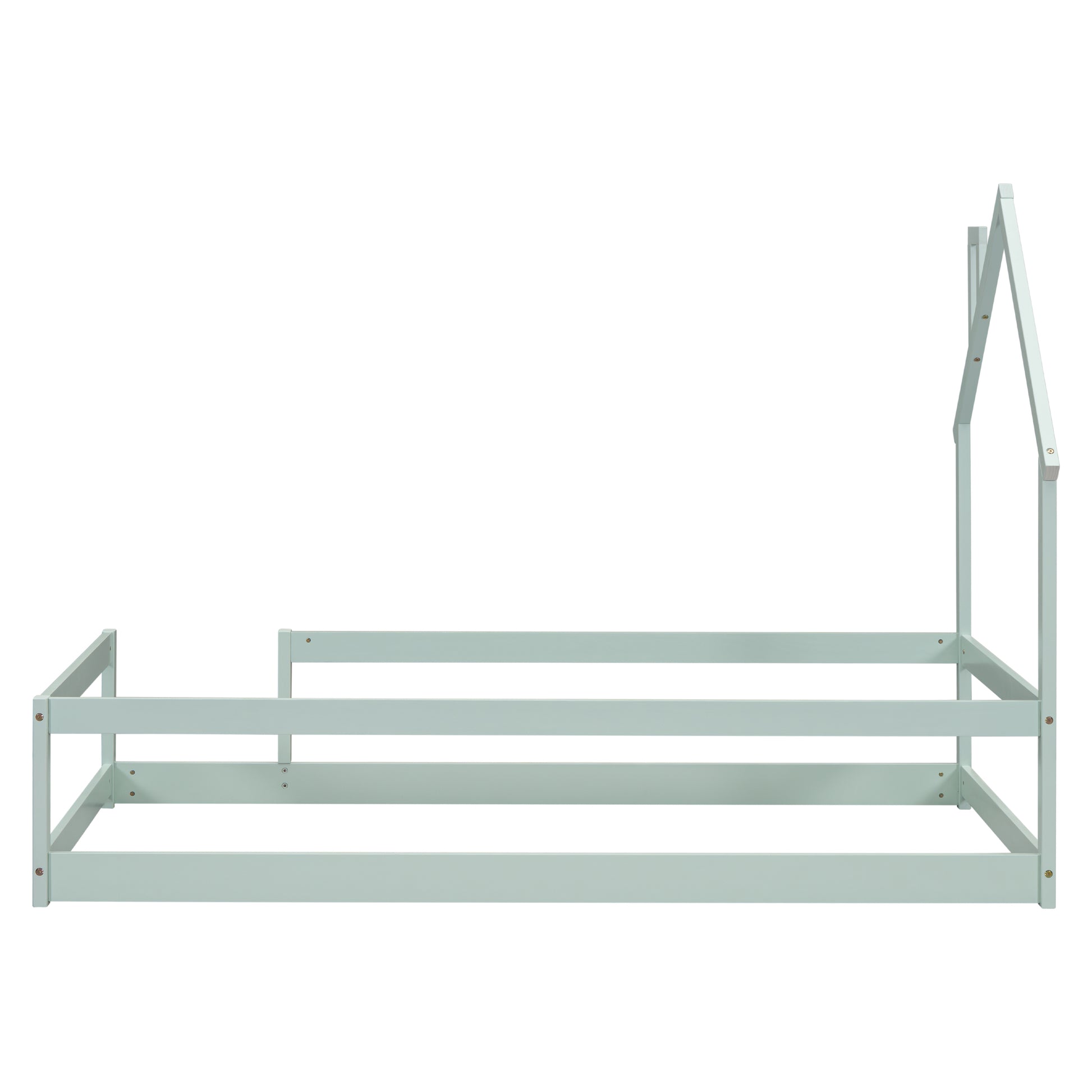Twin Size Wood bed with House-shaped Headboard Floor bed with Fences,Light Green