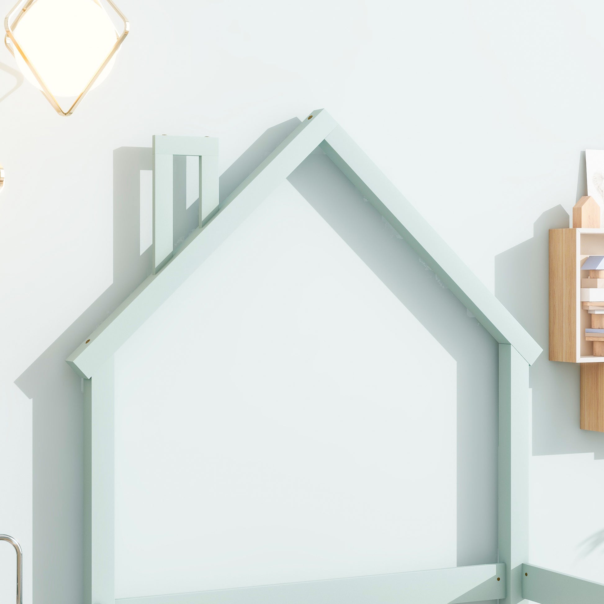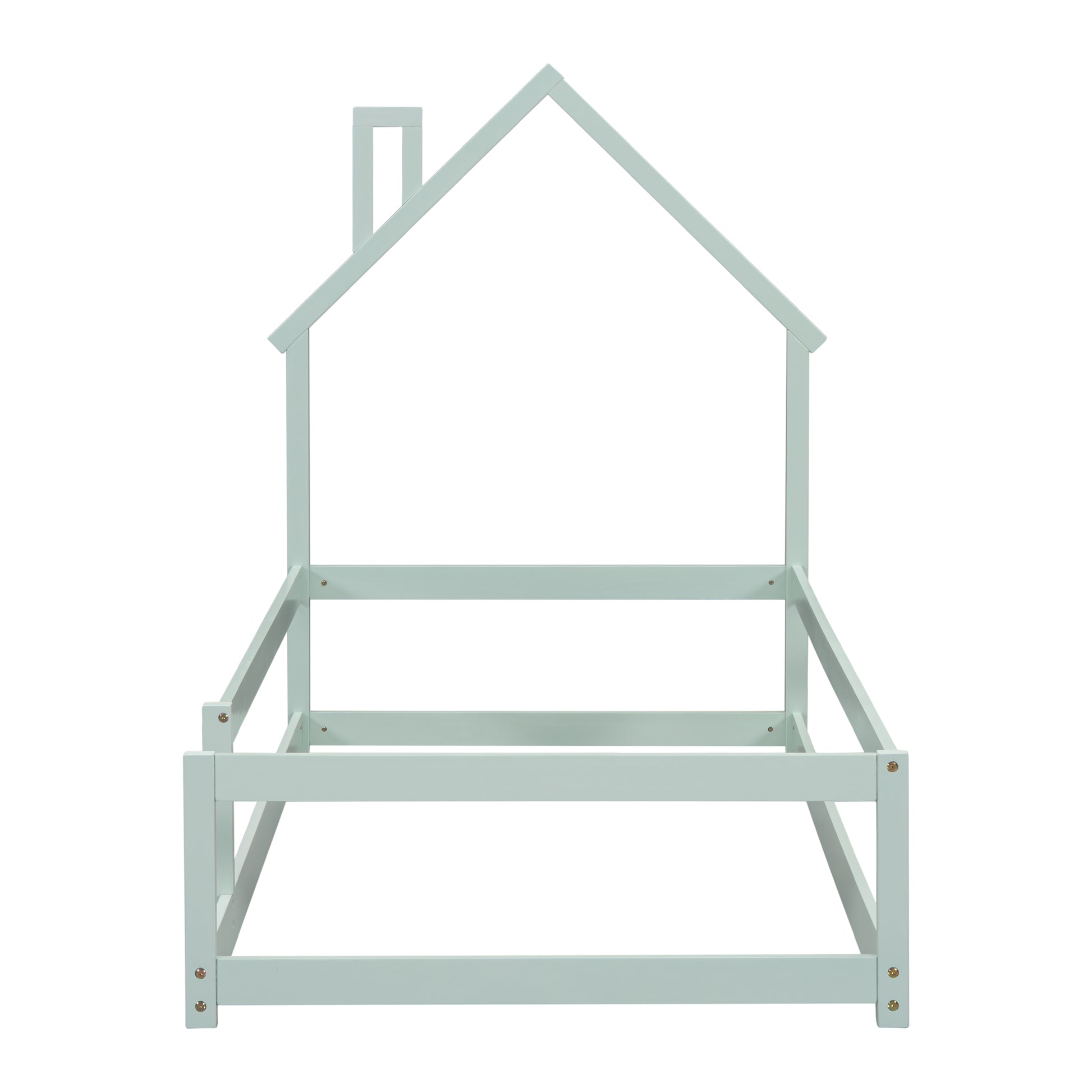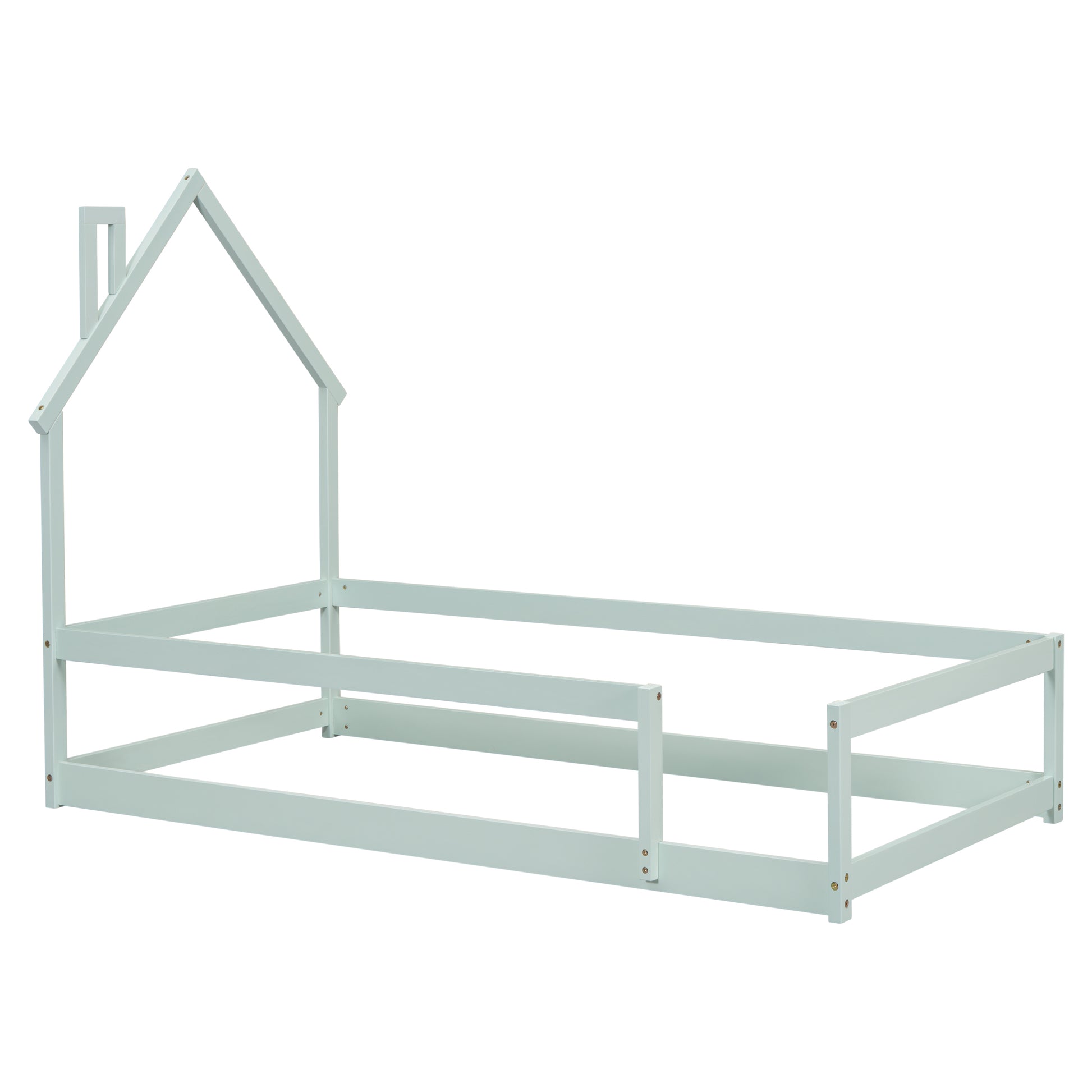 Twin Size Wood bed with House-shaped Headboard Floor bed with Fences,Light Green
